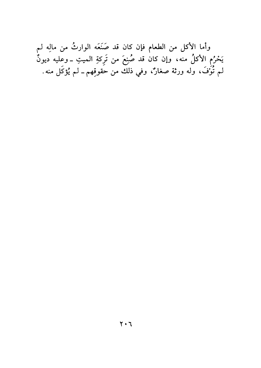 وأما الأكل من الطعام فإن كان قد صَنَعَه الوارثُ من مالِه لم يَحْرُم الأكلُ منه، وإن كان قد صُنِعَ من تَرِكةِ الميتِ - وعليه ديون لم تُوْفَ، وله ورثة صغار، وفي ذلك من حقوقِهم - لم يُؤكَل منه.