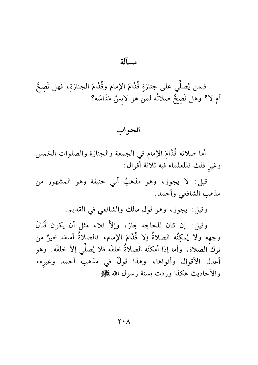 وقيل: إن كان للحاجة جاز، وإلَاّ فلا، مثل أن يكون قُبَالَ وجهِه ولا يُمكِنُه الصلاةُ إلا قُدَّامَ الإمام، فالصلاةُ أمامَه خيرٌ من ترك الصلاة، وأما إذا أمكنَه الصلاةُ خلفَه فلا يُصلِّي إلاّ خلفَه. وهو أعدل الأقوال وأقواها، وهذا قولٌ في مذهب أحمد وغيرِه، والأحاديث هكذا وردت بسنة رسول الله - صَلَّى اللَّهُ عَلَيْهِ وَسَلَّمَ -.