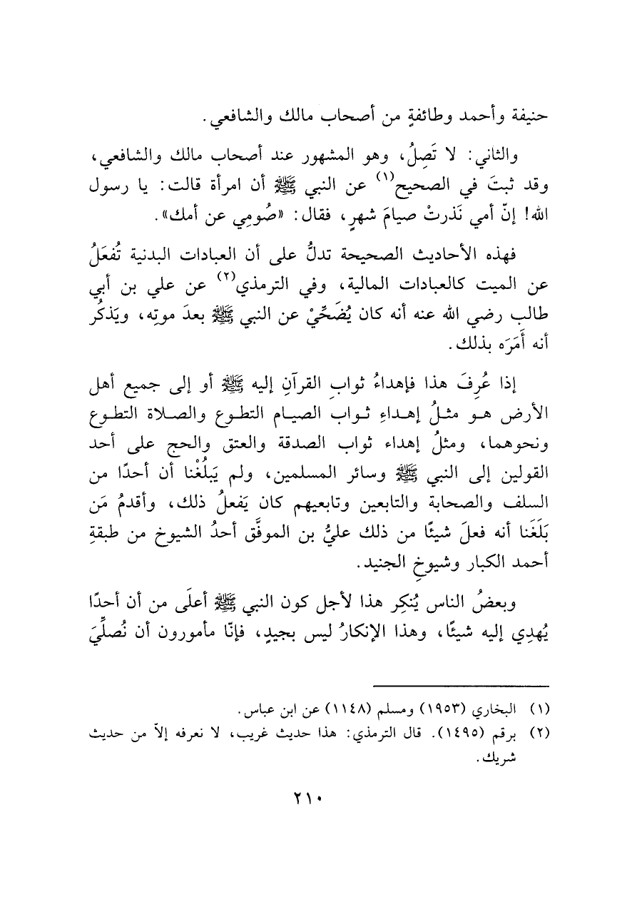 فهذه الأحاديث الصحيحة تدلُّ على أن العبادات البدنية تُفعَلُ عن الميت كالعبادات المالية، وفي الترمذي (¬٢) عن علي بن أبي طالب رضي الله عنه أنه كان يُضَحِّيْ عن النبي - صَلَّى اللَّهُ عَلَيْهِ وَسَلَّمَ - بعدَ موته، ويَذكُر أنه أَمَرَه بذلك.