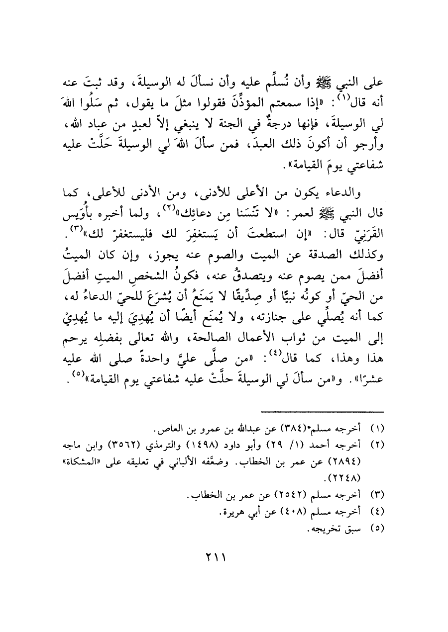 وكذلك الصدقة عن الميت والصوم عنه يجوز، وإن كان الميتُ أفضلَ ممن يصوم عنه ويتصدقُ عنه، فكونُ الشخصِ الميتِ أفضلَ من الحيّ أو كونُه نبيًّا أو صِدِّيقًا لا يَمنَعُ أن يُشرَعَ للحيّ الدعاءُ له، كما أنه يُصلِّي على جنازته، ولا يُمنَع أيضًا أن يُهدِيَ إليه ما يُهدِيْ إلى الميت من ثواب الأعمال الصالحة، والله تعالى بفضلِه يرحم هذا وهذا، كما قال (¬٤): "من صلَّى عليَّ واحدةً صلى الله عليه عشرًا". و"من سألَ لي الوسيلةَ حلَّتْ عليه شفاعتي يوم القيامة" (¬٥).