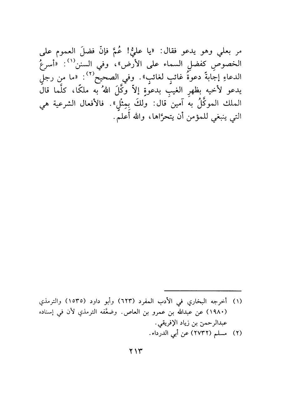 مر بعلي وهو يدعو فقال: "يا عليُّ! عُمَّ فإن فضلَ العموم على الخصوصِ كفضلِ السماء على الأرض"، وفي السنن (¬١): "أسرعُ الدعاءِ إجابةً دعوةُ غائب لغائبٍ". وفي الصحيح (¬٢): "ما من رجلٍ يدعو لأخيه بظهرِ الغيب بدعوةٍ إلاّ وكَّلَ اللهُ به ملكًا، كلَّما قال الملك الموكَّلُ به آمينَ قال: ولكَ بمِثْل". فالأفعال الشرعية هي التي ينبغي للمؤمن أن يتحرَّاها، والله أَعلم.