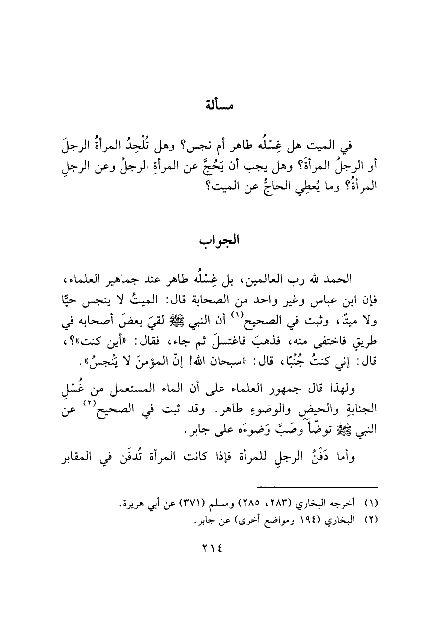 في الميت هل غِسْلُه طاهر أم نجس؟ وهل تُلْحِدُ المرأةُ الرجل أو الرجلُ المرأةَ؟ وهل يجب أن يَحُجَّ عن المرأةِ الرجلُ وعن الرجلِ المرأةُ؟ وما يُعطِي الحاجُّ عن الميت؟
