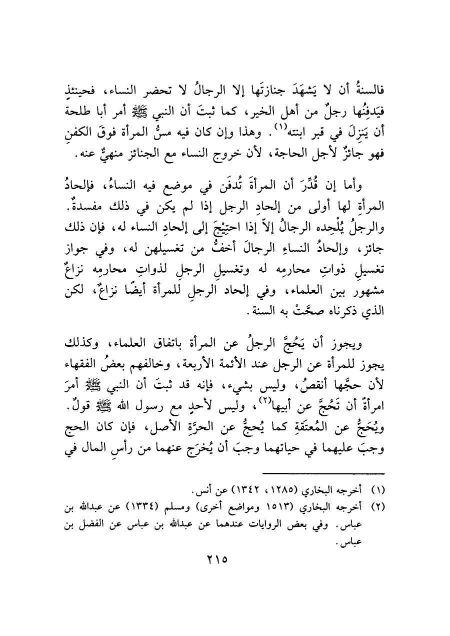 فالسنةُ أن لا يَشهَدَ جنازتَها إلا الرجالُ لا يحضر النساء، فحينئذٍ فيَدفِنُها رجلٌ من أهل الخير، كما ثبتَ أن النبي - صَلَّى اللَّهُ عَلَيْهِ وَسَلَّمَ - أمر أبا طلحة أن يَنزِلَ في قبر ابنته (¬١). وهذا وإن كان فيه مسُّ المرأة فوقَ الكفنِ فهو جائز لأجل الحاجة، لأن خروج النساء مع الجنائز منهيٌّ عنه.