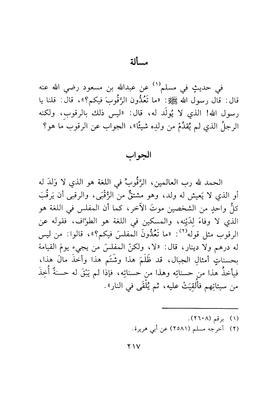 الحمد لله رب العالمين، الرَّقُوبُ في اللغة هو الذي لا وَلدَ له أو الذي لا يَعيش له ولد، وهو مشتق من الرُّقْبَى، والرقبى أن يَرقُبَ كل واحدٍ من الشخصين موتَ الآخر، كما أن المفلس في اللغة هو الذي لا وفاءَ لِدَينه، والمسكين في اللغة هو الطوَّاف، فقوله عن الرقوب مثل قوله (¬٢): "ما تَعُدُّونَ المفلسَ فيكم؟ "، قالوا: من ليس له درهم ولا دينار، قال: "لا، ولكن المفلسَ من يجيء يومَ القيامة بحسناتٍ أمثالِ الجبال، قد ظَلَمَ هذا وشَتَم هذا وأخذَ مالَ هذا، فيأخذُ هذا من حسناتِه وهذا من حسناتِه، فإذا لم يَبْقَ له حسنةٌ أُخِذَ من سيئاتِهم فألُقِيَتْ عليه، ثم يُلْقَى في النار".