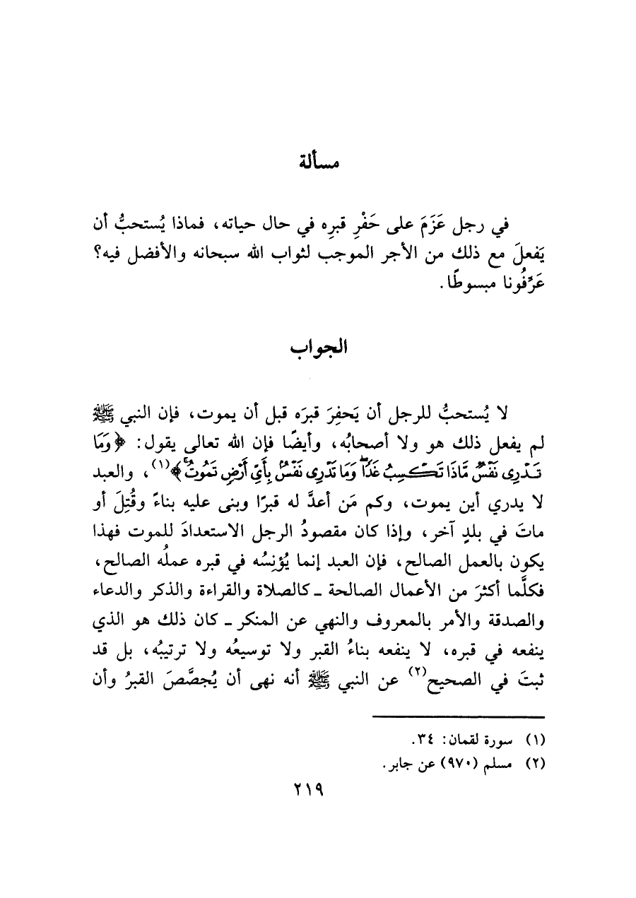 لا يُستحبُّ للرجل أن يَحفِرَ قبرَه قبل أن يموت، فإن النبي - صَلَّى اللَّهُ عَلَيْهِ وَسَلَّمَ - لم يفعلِ ذلك هو ولا أصحابُه، وأيضًا فإن الله تعالى يقول: (وَمَا تَدْرِي نَفْسٌ مَاذَا تَكْسِبُ غَداً وَمَا تَدْرِي نَفْسٌ بِأَيِّ أَرْضٍ تَمُوتُ) (¬١)، والعبد لا يدري أين يموت، وكم مَن أعدَّ له قبرًا وبني عليه بناءً وقُتِلَ أو ماتَ في بلدٍ آخر، وإذا كان مقصودُ الرجل الاستعدادَ للموت فهذا يكون بالعمل الصالح، فإن العبد إنما يُؤنسُه في قبره عملُه الصالح، فكلَّما أكثر من الأعمال الصالحة - كالصلاة والقراءة والذكر والدعاء والصدقة والأمر بالمعروف والنهي عن المنكر - كان ذلك هو الذي ينفعه في قبره، لا ينفعه بناءُ القبر ولا توسيعُه ولا ترتيبُه، بل قد ثبتَ في الصحيح (¬٢) عن النبي - صَلَّى اللَّهُ عَلَيْهِ وَسَلَّمَ - أنه نهى أن يُجصَّصَ القبرُ وأن
