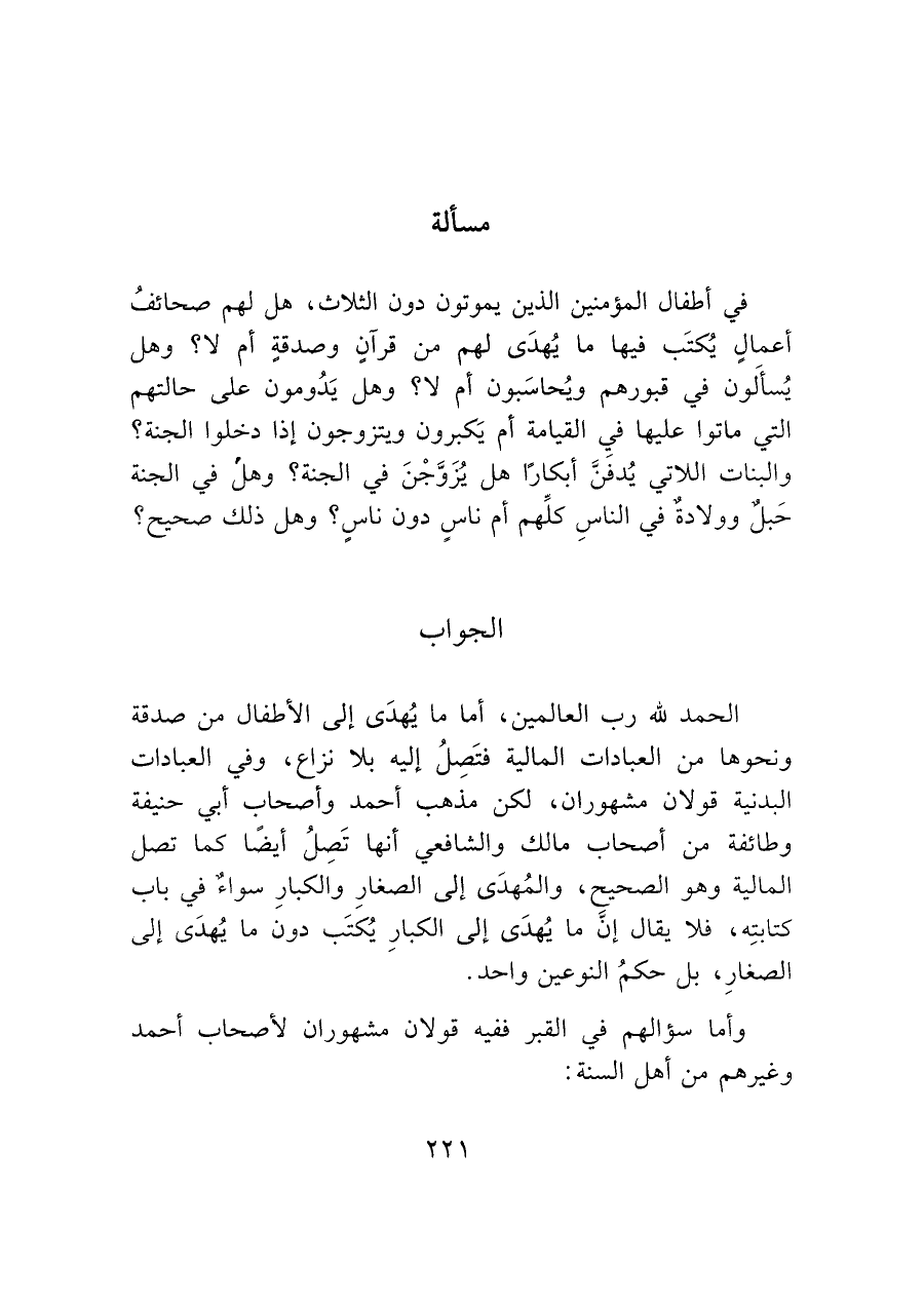 في أطفال المؤمنين الذين يموتون دون الثلاث، هل لهم صحائفُ أعمال يُكتَب فيها ما يُهدَى لهم من قرآنٍ وصدقة أم لا؟ وهل يُسأَلون في قبورهم ويُحاسَبون أم لا؟ وهل يَدُومون على حالتهم التي ماتوا عليها في القيامة أم يَكبرون ويتزوجون إذا دخلوا الجنة؟ والبنات اللاتي يُدفَنَّ أبكارًا هل يُزَوَّجْنَ في الجنة؟ وهل في الجنة حَبل وولادة في الناسِ كلِّهم أم ناس دون ناس؟ وهل ذلك صحيح؟