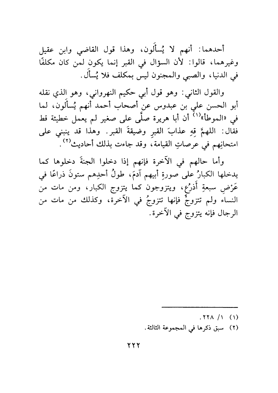 والقول الثاني: وهو قول أبي حكيم النهرواني، وهو الذي نقله أبو الحسن علي بن عبدوس عن أصحاب أحمد أنهم يُسأَلون، لما في "الموطأ" (¬١) أن أبا هريرة صلَّى على صغير لم يعمل خطيئة قط فقال: اللهمَّ قِهِ عذابَ القبرِ وضيقةَ القبر. وهذا قد ينبني على امتحانِهم في عرصاتِ القيامة، وقد جاءت بذلك أحاديث (¬٢).