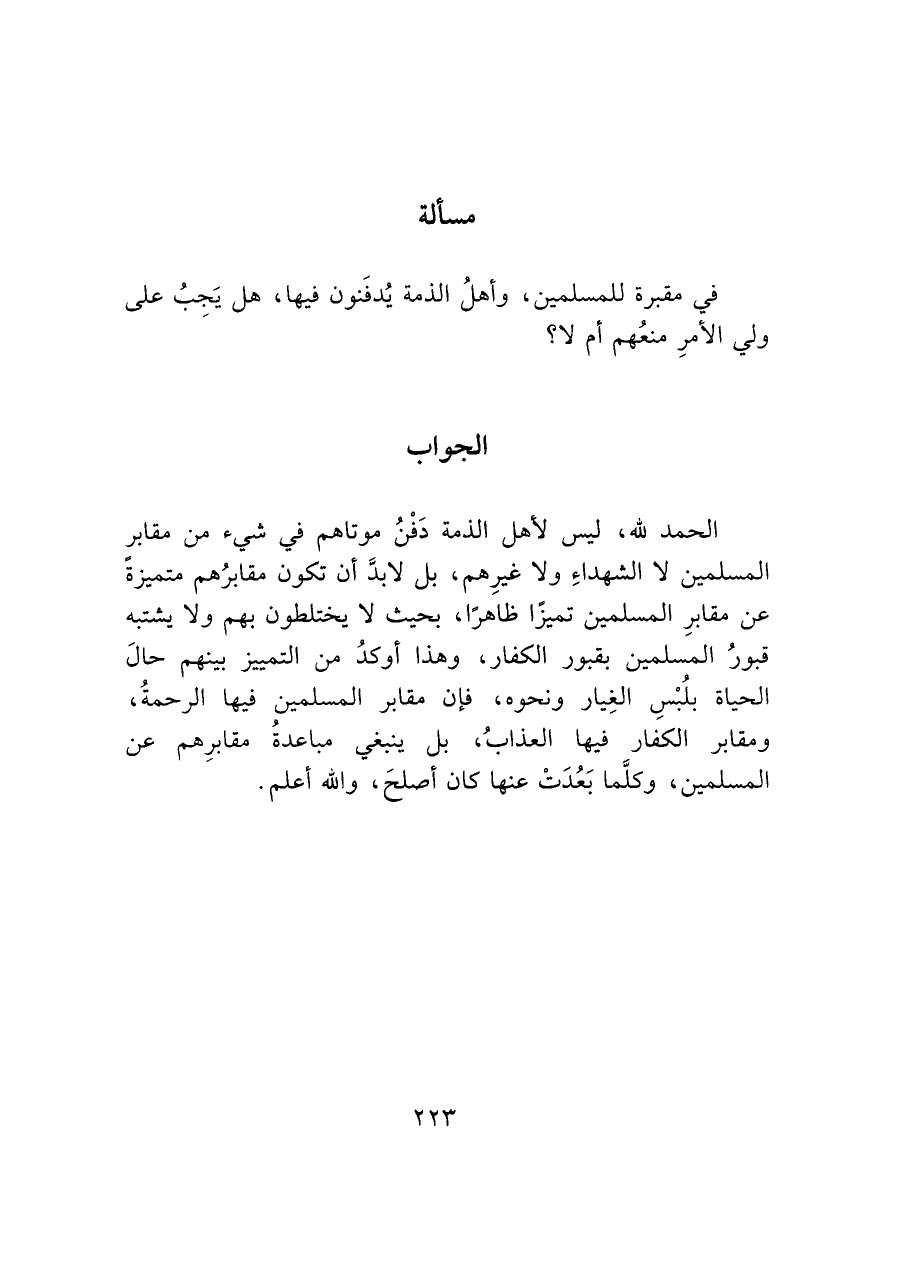 في مقبرة للمسلمين، وأهلُ الذمة يُدفَنون فيها، هل يَجبُ على ولي الأمرِ منعُهم أم لا؟