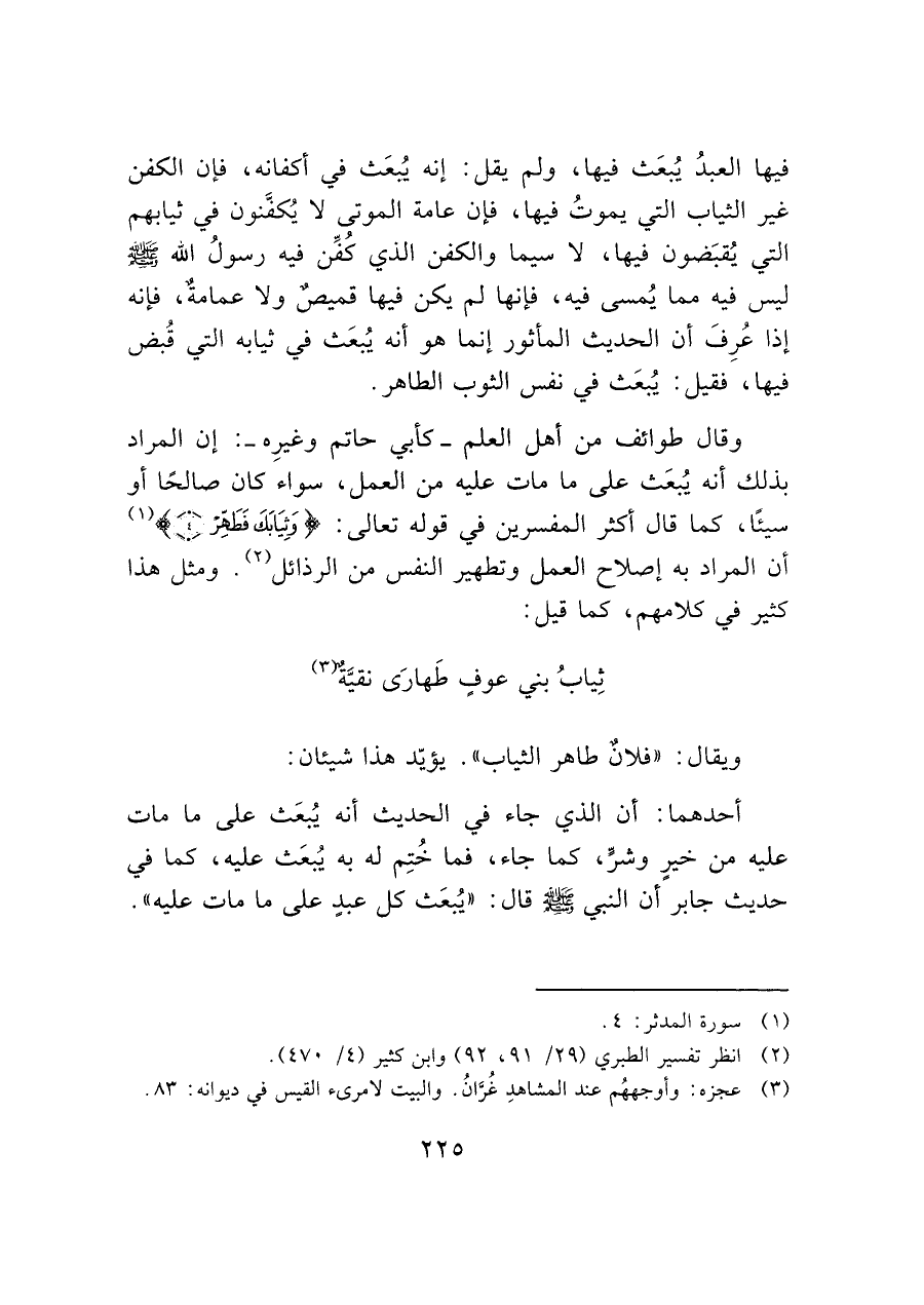 وقال طوائف من أهل العلم - كأبي حاتم وغيرِه -: إن المراد بذلك أنه يُبعث على ما مات عليه من العمل، سواء كان صالحًا أو سيئًا، كما قال أكثر المفسرين في قوله تعالى: (وَثِيَابَكَ فَطَهِّرْ (٤)) (¬١) أن المراد به إصلاح العمل وتطهير النفس من الرذائل (¬٢). ومثل هذا كثير في كلامهم، كما قيل:
