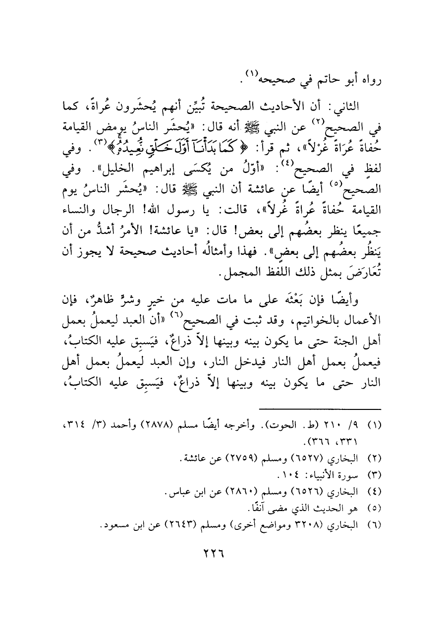 الثاني: أن الأحاديث الصحيحة تُبين أنهم يُحشَرون عُراةً، كما في الصحيح (¬٢) عن النبي - صَلَّى اللَّهُ عَلَيْهِ وَسَلَّمَ - أنه قال: "يُحشَر الناسُ يوم القيامة حُفاةً عُرَاةً غُرْلاً"، ثم قرأ: (كَمَا بَدَأْنَا أَوَّلَ خَلْقٍ نُعِيدُهُ) (¬٣). وفي لفظٍ في الصحيح (¬٤): "أوّلُ من يُكسَى إبراهيم الخليل". وفي الصحيح (¬٥) أيضًا عن عائشة أن النبي - صَلَّى اللَّهُ عَلَيْهِ وَسَلَّمَ - قال: "يُحشَر الناسُ يوم القيامة حُفاةً عُراةً غُرلاً"، قالت: يا رسول الله! الرجال والنساء جميعًا ينظر بعضُهم إلى بعض! قال: "يا عائشة! الأمرُ أشدُّ من أن يَنظُر بعضُهم إلى بعضٍ". فهذا وأمثالُه أحاديث صحيحة لا يجوز أن تُعَارَضَ بمثل ذلك اللفظ المجمل.