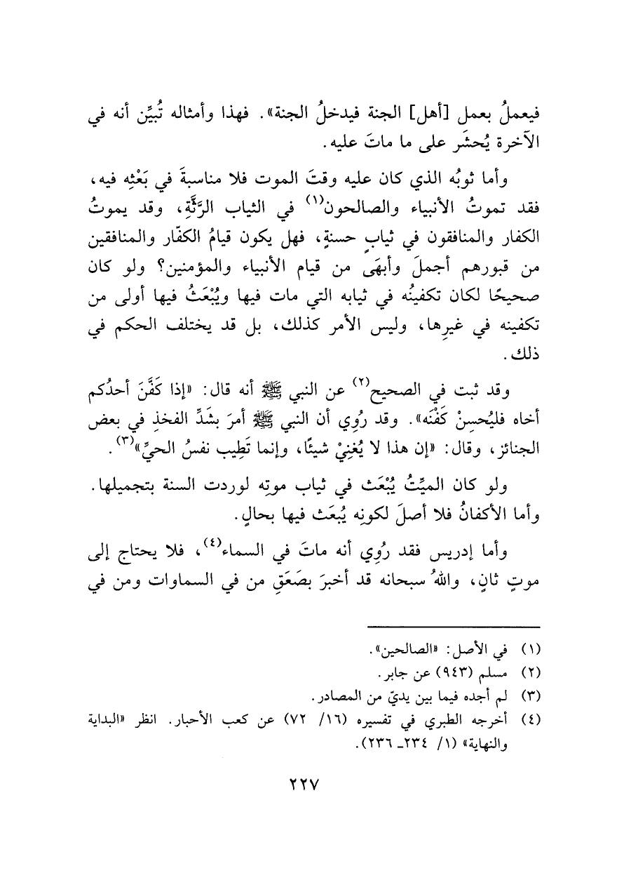 وأما ثوبُه الذي كان عليه وقتَ الموت فلا مناسبةَ في بَعْثِه فيه، فقد تموتُ الأنبياء والصالحون (¬١) في الثياب الرَّثَّةِ، وقد يموتُ الكفار والمنافقون في ثياب حسنةٍ، فهل يكون قيامُ الكفّار والمنافقين من قبورهم أجملَ وأبهَى من قيام الأنبياء والمؤمنين؟ ولو كان صحيحًا لكان تكفينُه في ثيابه التي مات فيها ويُبْعَثُ فيها أولى من تكفينه في غيرِها، وليس الأمر كذلك، بل قد يختلف الحكم في ذلك.