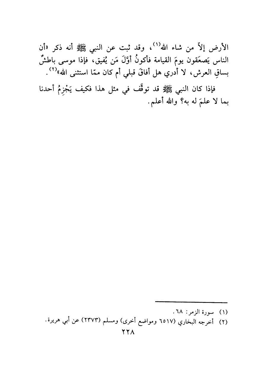 الأرض إلاّ من شاء الله (¬١)، وقد ثبت عن النبي - صَلَّى اللَّهُ عَلَيْهِ وَسَلَّمَ - أنه ذكر "أن الناس يَصعَقون يومَ القيامة فأكونُ أوَّلَ مَن أفيقُ، فأجدُ موسى باطش بساقِ العرش، لا أدري هل أفاقَ قبلي أم كان ممّا استثنى الله" (¬٢).