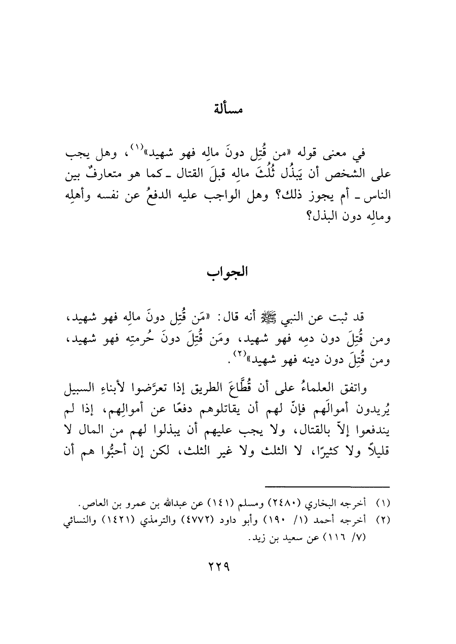 في معنى قوله "من قُتِل دونَ مالِه فهو شهيد" (¬١)، وهل يجب على الشخص أن يَبذُل ثُلُثَ مالِه قبلَ القتال - كما هو متعارفٌ بين الناس - أم يجوز ذلك؟ وهل الواجب عليه الدفعُ عن نفسه وأهلِه ومالِه دون البذل؟
