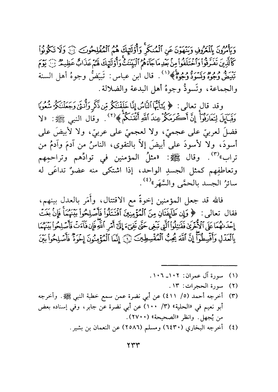 وقد قال تعالى: (يَا أَيُّهَا النَّاسُ إِنَّا خَلَقْنَاكُمْ مِنْ ذَكَرٍ وَأُنْثَى وَجَعَلْنَاكُمْ شُعُوباً وَقَبَائِلَ لِتَعَارَفُوا إِنَّ أَكْرَمَكُمْ عِنْدَ اللَّهِ أَتْقَاكُمْ) (¬٢). وقال النبي - صَلَّى اللَّهُ عَلَيْهِ وَسَلَّمَ -: "إلا فضلَ لعربيّ على عجمي، ولا لعجميّ على عربي، ولا لأبيضَ على أسودَ، ولا لأسودَ على أبيضَ إلاّ بالتقوى، الناسُ من آدمَ وآدمُ من تراب" (¬٣). وقال - صَلَّى اللَّهُ عَلَيْهِ وَسَلَّمَ -: "مثلُ المؤمنين في توادِّهم وتراحمِهم وتعاطفِهم كمثل الجسدِ الواحد، إذا اشتكى منه عضوٌ تداعَى له سائرُ الجسد بالحمَّى والسَّهَر" (¬٤).