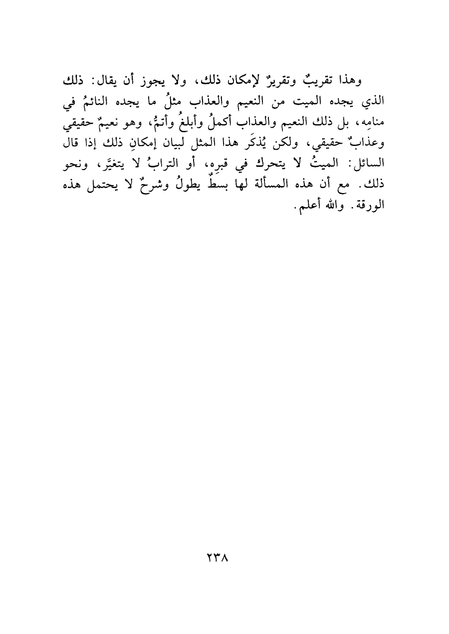 وهذا تقريب وتقرير لإمكان ذلك، ولا يجوز أن يقال: ذلك الذي يجده الميت من النعيم والعذاب مثلُ ما يجده النائمُ في منامِه، بل ذلك النعيم والعذاب أكملُ وأبلغُ وأتمُّ، وهو نعيمٌ حقيقي وعذابٌ حقيقي، ولكن يُذكَر هذا المثل لبيان إمكانِ ذلك إذا قال السائل: الميتُ لا يتحرك في قبرِه، أو الترابُ لا يتغير، ونحو ذلك. مع أن هذه المسألة لها بسط يطولُ وشرح لا يحتمل هذه الورقة. والله أعلم.