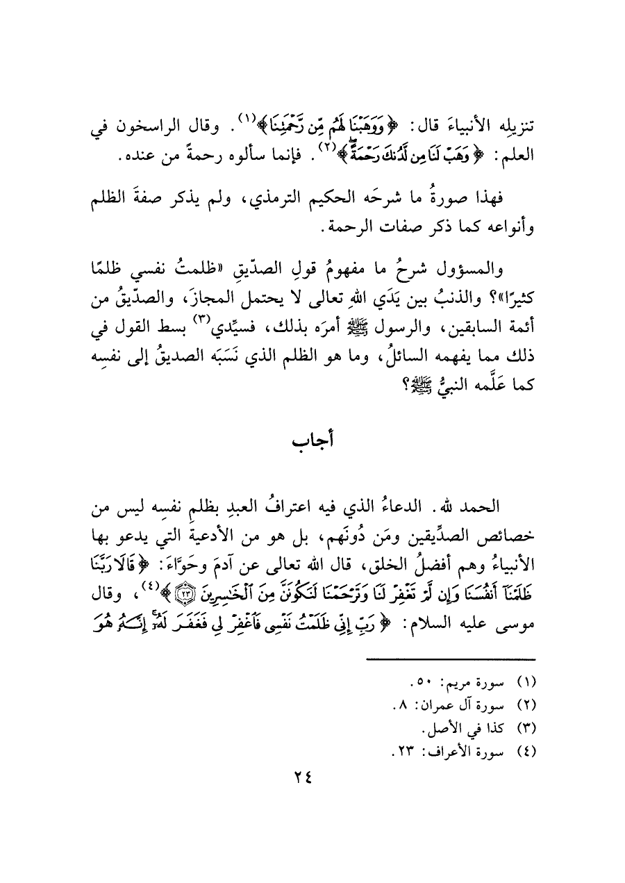 والمسئولُ شرحُ ما مفهومُ قولِ الصدّيقِ "ظلمتُ نفسي ظلمًا كثيرًا"؟ والذنبُ بين يَدَي الله تعالى لا يحتمل المجازَ، والصدّيقُ من أئمة السابقين، والرسول - صَلَّى اللَّهُ عَلَيْهِ وَسَلَّمَ - أمرَه بذلك، فسيِّدي بسط القول في ذلك مما يفهمه السائلُ، وما هو الظلم الذي نَسَبَه الصديقُ إلى نفسه كما عَلَّمه النبيُّ - صَلَّى اللَّهُ عَلَيْهِ وَسَلَّمَ -؟