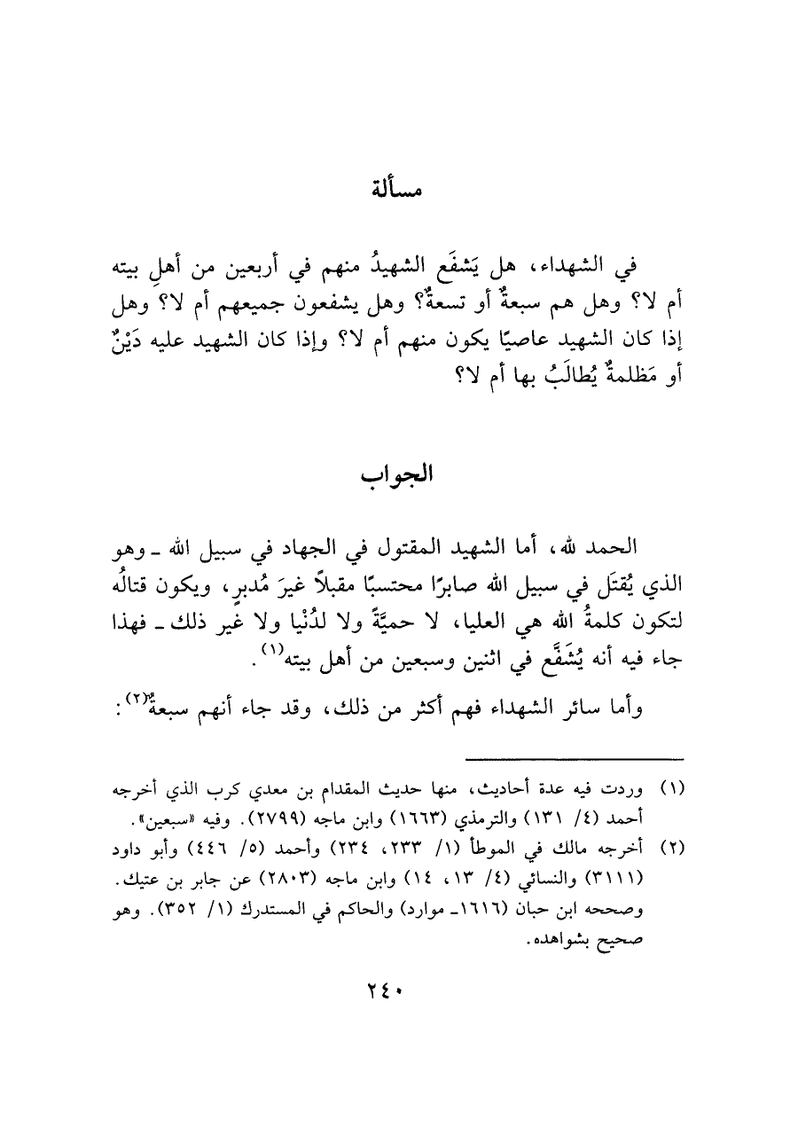 في الشهداء، هل يَشفَع الشهيدُ منهم في أربعين من أهلِ بيته أم لا؟ وهل هم سبعةٌ أو تسعة؟ وهل يشفعون جميعهم أم لا؟ وهل إذا كان الشهيد عاصيًا يكون منهم أم لا؟ وإذا كان الشهيد عليه دَيْن أو مَظلمةٌ يُطالَبُ بها أم لا؟