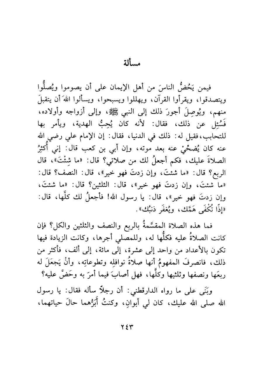 فيمن يَحُضُّ الناسَ من أهل الإيمان على أن يصوموا ويُصلُّوا ويتصدقوا، ويقرأوا القرآن، ويهللوا ويسبحوا، ويسألوا الله أن يتقبلَ منهم، ويُوصِلَ أجورَ ذلك إلى النبي - صَلَّى اللَّهُ عَلَيْهِ وَسَلَّمَ -، وإلى أزواجه وأولاده، فَسُئِل عن ذلك، فقال: لأنه كان يُحِبُّ الهدية، ويأمر بها للتحابب، فقيل له: ذلك في الدنيا، فقال: إن الإمام علي رضي الله عنه كان يُضحِّيْ عنه بعد موته، وإن أبي بن كعب قال: إني أُكثِرُ الصلاةَ عليك، فكم أجعلُ لك من صلاتي؟ قال: "ما شِئْتَ"، قال الربع؟ قال: "ما شئتَ، وإن زدتَ فهو خير"، قال: النصف؟ قال: "ما شئتَ، وإن زدتَ فهو خير"، قال: الثلثين؟ قال: "ما شئتَ، وإن زدتَ فهو خير"، قال: يا رسول الله! فاجعلُ لك كلَّها، قال: "إذًا تكفَى هَمَّك، ويُغفَر ذنبُك".