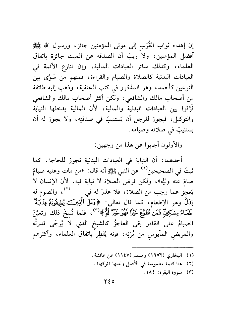 إن إهداء ثواب القُرَب إلى موتى المؤمنين جائز، ورسول الله - صَلَّى اللَّهُ عَلَيْهِ وَسَلَّمَ - أفضل المؤمنين، ولَا ريبَ أن الصدقة عن الميت جائزة باتفاق العلماء، وكذلك سائر العبادات المالية، هان تنازع الأئمة في العبادات البدنية كالصلاة والصيام والقراءة، فمنهم من سَوَّى بين النوعين كأحمد، وهو المذكور في كتب الحنفية، وذهب إليه طائفة مِن أصحاب مالك والشافعي، ولكن أكثر أصحاب مالك والشافعي فرَّقوا بين العبادات البدنية والمالية، لأن المالية يدخلها النيابة والتوكيل، فيجوز للرجل أن يَستنيبَ في صدقتِه، ولا يجوز له أن يستنيبَ في صلاته وصيامه.