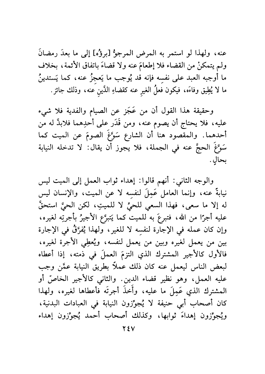 والوجه الثاني: أنهم قالوا: إهداء ثواب العمل إلى الميت ليس نيابةً عنه، وإنما العامل عَمِلَ لنفسِه لا عن الميت، والإنسان ليس له إلاّ ما سعى، فهذا السعي للحى لا للميتِ، لكن الميت استحق عليه أجرًا من الله، فتبرعَ به للميت كما يتبرع الأجيرُ بأجرتِه لغيره، وإن كان عمله في الإجارة لنفسِه لا للغير، ولهذا يفرق في الإجارة بين من يعمل لغيره وبين من يعمل لنفسه، ويُعطِي الأجرة لغيره، فالأول كالأجير المشترك الذي التزمَ العملَ في ذمته، إذا أعطاه لبعض الناس ليعمل عنه كان ذلك عملاً بطريق النيابة عمَن وجب عليه العمل، وهو نظير قضاء الدين. والثاني كالأجير الخاصّ أو المشترك الذى عَمِلَ ما عليه، وأَخذَ أجرتَه فأعطاها لغيره، ولهذا كان أصحاب أبي حنيفة لا يُجوزون النيابة في العبادات البدنية، ويُجوزون إهداءَ ثوابها، وكذلك أصحاب أحمد يُجوِّزون إهداء