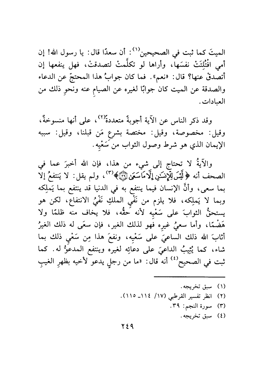 والآية لا تحتاج إلى شيء من هذا، فإن الله أخبرَ عما في الصحف أنه (لَيْسَ لِلْإِنْسَانِ إِلَّا مَا سَعَى (٣٩)) (¬٣)، ولم يقل: لا يَنتفعُ إلاّ بما سعى، وأنَ الإنسان فيما ينتفع به في الدنيا قد ينتفع بما يَملِكه وبما لا يَملِكه، فلا يلزم من نَفْيِ الملكِ نَفْي الانتفاع، لكن هو يستحقُّ الثوابَ على سَعْيِه لأنه حفُه، فلا يَخاف منه ظلمًا ولا هَضْمَا، وأما سعيُ غيرِه فهو لذلك الغير، فإن سعَى له ذلك الغيرُ أثابَ الله ذلك الساعيَ على سَعْيه، ونفعَ هذا مِن سَعْيِ ذلك بما شاء، كما يثيبُ الداعيَ على دعَائِه لغيره وينتفع المدعوُّ له. كما ثبت في الصحيح (¬٤) أنه قال: "ما من رجلٍ يدعو لأخيه بظهرِ الغيبِ