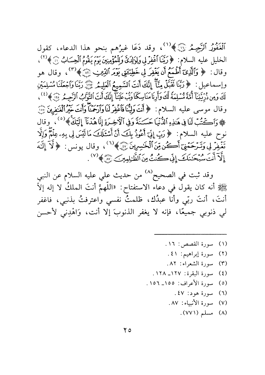وقال: (وَاَلَذِىَ أَطمَعُ أَن يَغفِرَ لِى خطيئتِى يوم اَلدِين (٨٢)) (¬٣)، وقال هو وإسماعيل: (رَبنَا تَقَبًل مِنَّا إِنكَ أَنتَ اَلسَمِيعُ العليم (١٢٧) ربنا واجعلنا مسلمين لك ومن ذريتنا أمة مسلمة لك وَأَرِنَا مَنَاسِكَنَا وَتُبْ عَلينَا إِنكَ أَنت التَوابُ اَلرحيم (١٢٨)) (¬٤)، وقال موسى عليه السلام: (أنت ولينا فأغفر لنا وارحمنا وأنت خير الغافرينَ (١٥٥) واكتب لنا في هذه الدنيا حسنة وفي الآخرة إنَّا هدنا إليك) (¬٥)، وقال نوح عليه السلام: (رَب أنى أعوذ بك أن أسئلك ما ليس لى به علم وإلا تغفر لى وترحمنى أكن من الخاسرين (٤٧)) (¬٦)، وقال يونس: (لا إله إِلَّاَ أنتَ سُبْحانكِّ إنى كنت من الظالمين (٨٧)) (¬٧).
