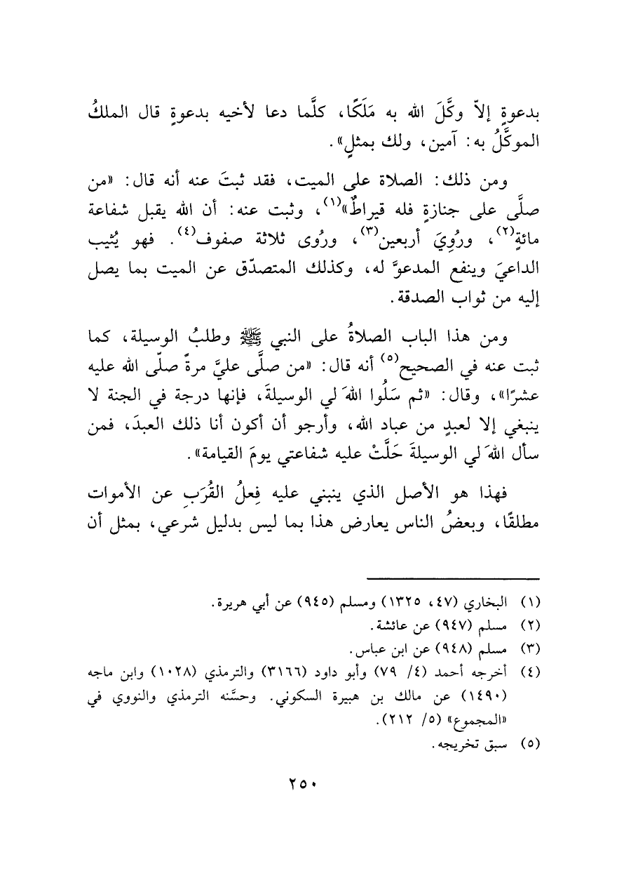 ومن ذلك: الصلاة على الميت، فقد ثبتَ عنه أنه قال: "من صلَّى على جنازةٍ فله قيراط" (¬١)، وثبت عنه: أن الله يقبل شفاعة مائةٍ (¬٢)، ورُوِيَ أربعين (¬٣)، ورُوى ثلاثة صفوف (¬٤). فهو يثيب الداعيَ وينفع المدعوَّ له، وكذلك المتصدّق عن الميت بما يصل إليه من ثواب الصدقة.
