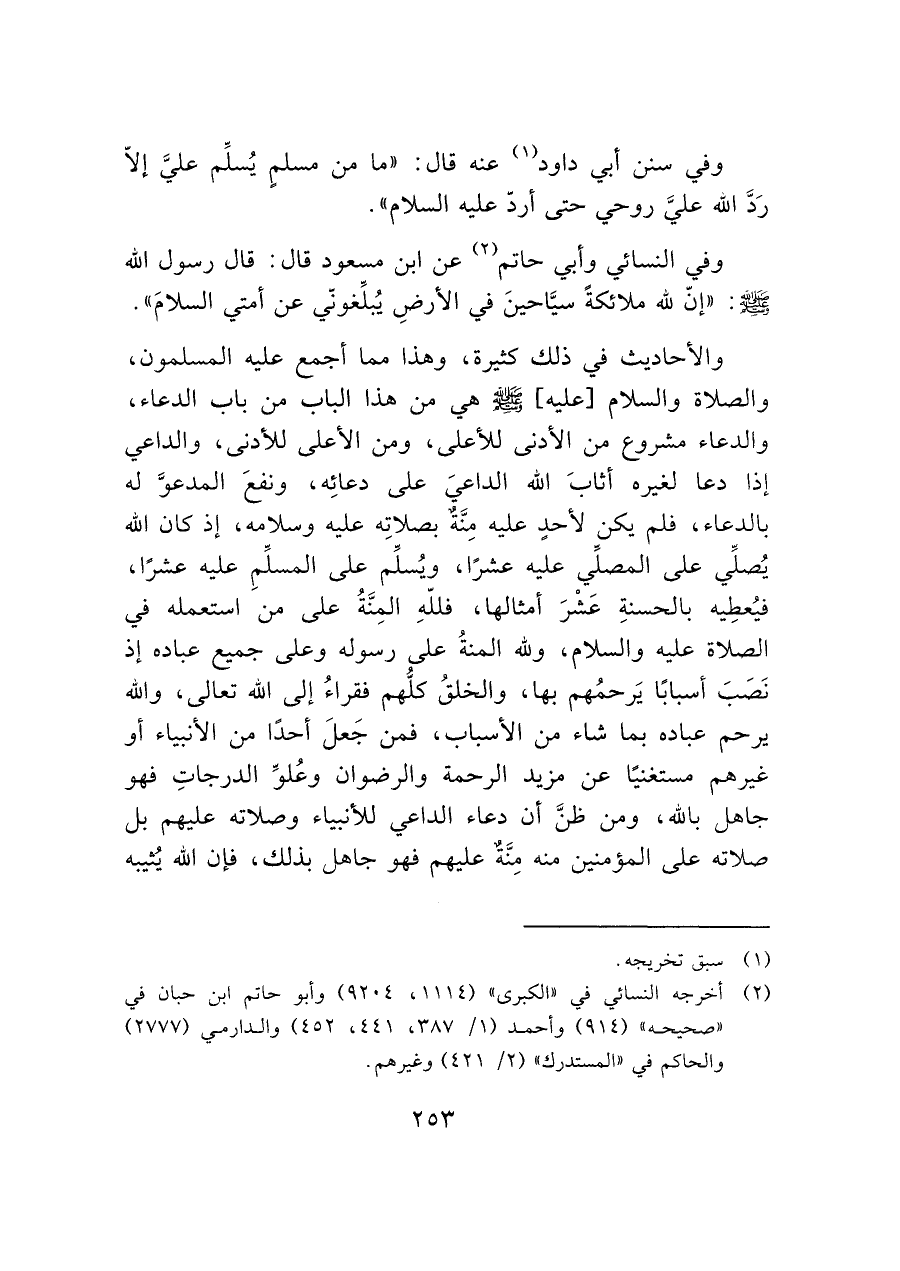 والأحاديث في ذلك كثيرة، وهذا مما أجمع عليه المسلمون، والصلاة والسلام [عليه]- صَلَّى اللَّهُ عَلَيْهِ وَسَلَّمَ - هي من هذا الباب من باب الدعاء، والدعاء مشروع من الأدنى للأعلى، ومن الأعلى للأدنى، والداعي إذا دعا لغيره أثابَ الله الداعيَ على دعائِه، ونفعَ المدعوَ له بالدعاء، فلم يكن لأحدٍ عليه مِنَّة بصلاتِه عليه وسلامه، إذ كان الله يُصقَي على المصلِّي عليه عشرًا، ويُسلِّم على المسلَمِ عليه عشرًا، فيُعطِيه بالحسنةِ عَشْرَ أمثالها، فللهِ المِنَّةُ على من استعمله في الصلاة عليه والسلام، ولله المنةُ على رسوله وعلى جميع عباده إذ نَصَبَ أسبابًا يَرحمُهم بها، والخلقُ كلُّهم فقراءُ إلى الله تعالى، والله يرحم عباده بما شاء من الأسباب، فمن جَعلَ أحدًا من الأنبياء أو غيرهم مستغنيًا عن مزيد الرحمة والرضوان وعُلوَ الدرجاتِ فهو جاهل بالته، ومن ظنَّ أن دعاء الداعي للأنبياء وصلاته عليهم بل صلاته على المؤمنين منه مِنة عليهم فهو جاهل بذلك، فإن الله يُثيبه