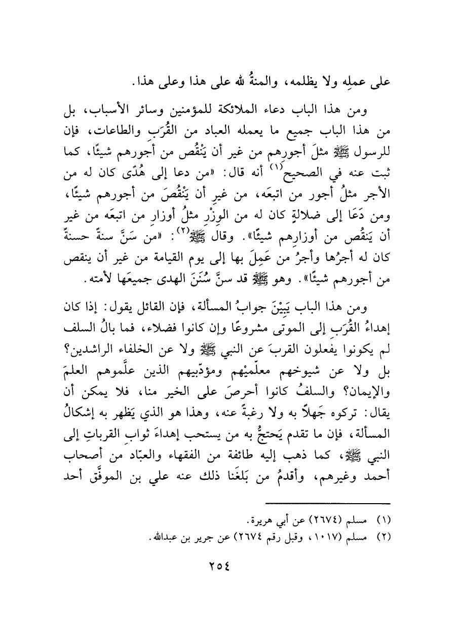بل ولا عن شيوخهم معلّميْهم ومؤدّبيهم الذين علَّموهم العلمَ والإيمان؟ والسلفُ كانوا أحرصَ على الخير منا، فلا يمكن أن يقال: تركوه جهلا به ولا رغبة عنه، وهذا هو الذي يَظهر به إشكالُ المسألة، فإن ما تقدم يَحتبئُ به من يستحب إهداءَ ثواب القرباتِ إلى النبي - صَلَّى اللَّهُ عَلَيْهِ وَسَلَّمَ -، كما ذهب إليه طائفة من الفقهاء والعبّادَ من أصحاب أحمد وغيرهم، وأقدمُ من بَلغَنا ذلك عنه علي بن الموفق أحد