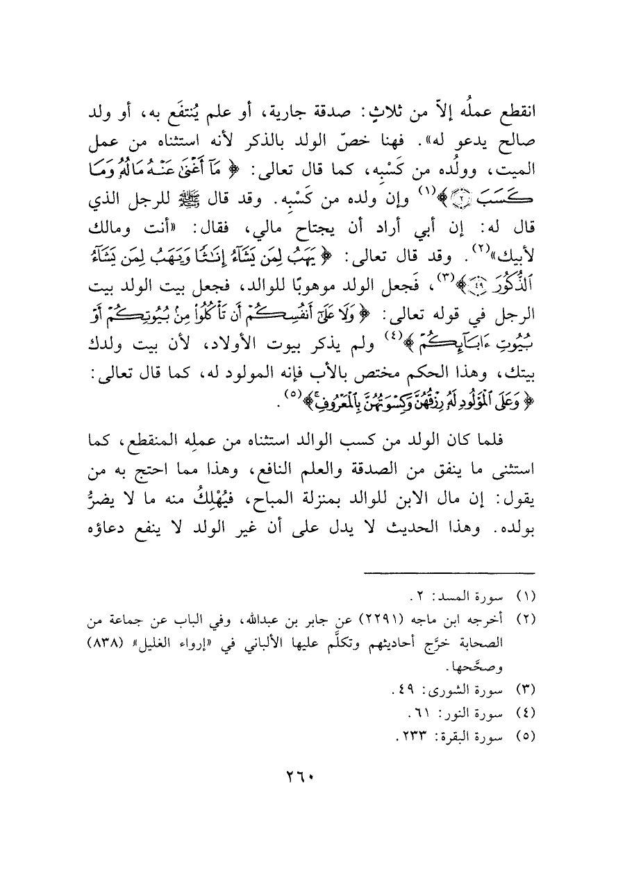 انقطع عملُه إلاّ من ثلاثٍ: صدقة جارية، أو علم يُنتفَع به، أو ولد صالح يدعو له". فهنا خصّ الولد بالذكر لأنه استثناه من عمل الميت، وولُده من كَسْبِه، كما قال تعالى: (مَا أَغْنَى عَنْهُ مَالُهُ وَمَا كَسَبَ (٢)) (¬١) وإن ولده من كَسْبه. وقد قال - صَلَّى اللَّهُ عَلَيْهِ وَسَلَّمَ - للرجل الذي قال له: إن أبي أراد أن يجتاحَ مالي، فقال: "أنت ومالك لأبيك" (¬٢). وقد قال تعالى: (يَهَبُ لِمَنْ يَشَاءُ إِنَاثاً وَيَهَبُ لِمَنْ يَشَاءُ الذُّكُورَ (٤٩)) (¬٣)، فَجعل الولد موهوباً للوالد، فجعل بيت الولد بيت الرجل في قوله تعالى: (وَلا عَلَى أَنْفُسِكُمْ أَنْ تَأْكُلُوا مِنْ بُيُوتِكُمْ أَوْ بُيُوتِ آبَائِكُمْ) (¬٤) ولم يذكر بيوت الأولاد، لأن بيت ولدك بيتك، وهذا الحكم مختص بالأب فإنه المولود له، كما قال تعالى: (وَعَلَى الْمَوْلُودِ لَهُ رِزْقُهُنَّ وَكِسْوَتُهُنَّ بِالْمَعْرُوفِ) (¬٥).