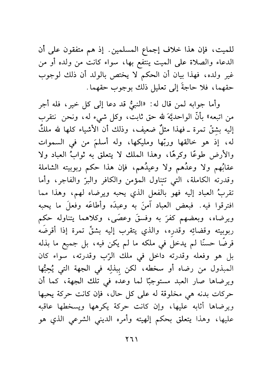 وأما جوابه لمن قال له: "النبيُّ قد دعا إلى كل خير، فله أجر من اتبعه " بأنّ الواحديَّهَ لله حق ثابت، وكل شيء له، ونحن نتقرب إليه بشِقِّ تمرة -فهذا مثلٌ ضعيف، وذلك أن الأشياء كلها لته ملكٌ له، إذ هو خالقها وربّها ومليكها، وله أسلمَ من في السماوات والأرض طوعًا وكرهًا، وهذا الملك لا يتعلق به ثوابُ العباد ولا عقابُهم ولا وعدُهم ولا وعيدُهم، فإن هذا حكم ربوبيته الشاملة وقدرته الكاملة، التي تتناول المؤمن والكافر والبرّ والفاجر، وأما تقربُ العباد إليه فهو بالفعل الذي يحبه ويرضاه لهم، وهذا مما افترقوا فيه. فبعض العباد آمنَ به وعبدَه وأطاعَه وفعلَ ما يحبه ويرضاه، وبعضهم كفرَ به وفسقَ وعصى، وكلاهما يتناوله حكم ربوبيته وقضائِه وقدرِه، والذي يتقرب إليه بشقِّ تمرة إذا أقرضَه قرضًا حسنًا لم يدخل في ملكه ما لم يكن فيه، بل جميع ما بذله بل هو وفعله وقدرته داخل في ملك الرّب وقدرته، سواء كان المبذول من رضاه أو سخطه، لكن بِبذلِه في الجهة التي يُحِبُّها ويرضاها صار العبد مستوجبًا لما وعده في تلك الجهة، كما أن حركات بدنه هي مخلوقة له على كل حال، فإن كانت حركة يحبها ويرضاها أثابه عليها، وإن كانت حركة يكرهها ويسخطها عاقبه عليها، وهذا يتعلق بحكم إلهيته وأمره الديني الشرعي الذي هو