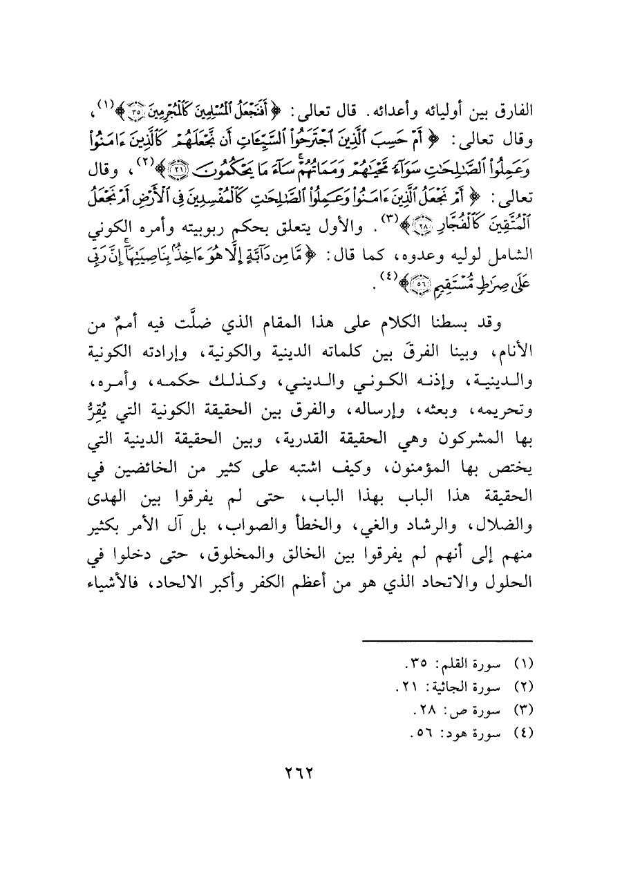 الفارق بين أوليائه وأعدائه. قال تعالى: (أَفَنَجْعَلُ الْمُسْلِمِينَ كَالْمُجْرِمِينَ (٣٥)) (¬١)، وقال تعالى: (أَمْ حَسِبَ الَّذِينَ اجْتَرَحُوا السَّيِّئَاتِ أَنْ نَجْعَلَهُمْ كَالَّذِينَ آمَنُوا وَعَمِلُوا الصَّالِحَاتِ سَوَاءً مَحْيَاهُمْ وَمَمَاتُهُمْ سَاءَ مَا يَحْكُمُونَ (٢١)) (¬٢)، وقال تعالى: (أَمْ نَجْعَلُ الَّذِينَ آمَنُوا وَعَمِلُوا الصَّالِحَاتِ كَالْمُفْسِدِينَ فِي الْأَرْضِ أَمْ نَجْعَلُ الْمُتَّقِينَ كَالْفُجَّارِ (٢٨)) (¬٣). والأول يتعلق بحكم ربوبيته وأمره الكوني الشامل لوليه وعدوه، كما قال: (مَا مِنْ دَابَّةٍ إِلَّا هُوَ آخِذٌ بِنَاصِيَتِهَا إِنَّ رَبِّي عَلَى صِرَاطٍ مُسْتَقِيمٍ (٥٦)) (¬٤).
