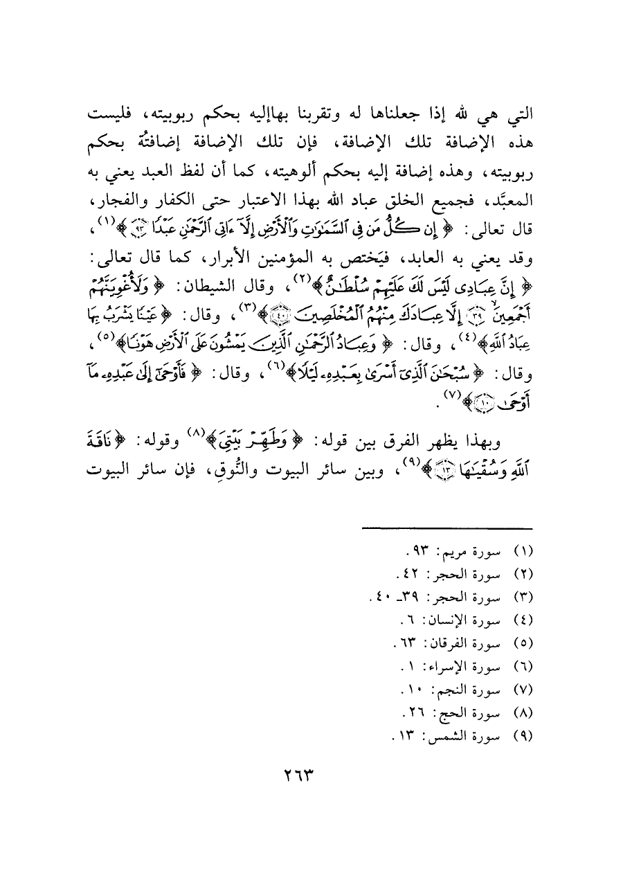 التي هي لله إذا جعلناها له وتقربنا بها إليه بحكم ربوبيته، فليست هذه الإضافة تلك الإضافة، فإن تلك الإضافة إضافتهٌ بحكم ربوبيته، وهذه إضافة إليه بحكم ألوهيته، كما أن لفظ العبد يعني به المعبَّد، فجميع الخلق عباد الله بهذا الاعتبار حتى الكفار والفجار، قال تعالى: (إِنْ كُلُّ مَنْ فِي السَّمَاوَاتِ وَالْأَرْضِ إِلَّا آتِي الرَّحْمَنِ عَبْداً (٩٣)) (¬١)، وقد يعني به العابد، فيَختص به المؤمنين الأبرار، كما قال تعالى: (إِنَّ عِبَادِي لَيْسَ لَكَ عَلَيْهِمْ سُلْطَانٌ) (¬٢)، وقال الشيطان: (وَلَأُغْوِيَنَهُم أَجمعِينَ (٣٩) إِلَّا عبادَكَ مِنهُمُ اَلمُخلَصِينَ (٤٠)) (¬٣)، وقال: (عَيْناً يَشْرَبُ بِهَا عِبَادُ اللَّهِ) (¬٤)، وقال: (وَعِبَادُ الرَّحْمَنِ الَّذِينَ يَمْشُونَ عَلَى الْأَرْضِ هَوْناً) (¬٥)، وقال: (سُبْحَانَ الَّذِي أَسْرَى بِعَبْدِهِ لَيْلاً) (¬٦)، وقال: (فَأَوْحَى إِلَى عَبْدِهِ مَا أَوْحَى (١٠)) (¬٧).