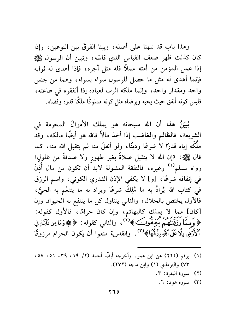 يُبيِّن هذا أن الله سبحانه هو يملك الأموالَ المحرمة في الشريعة، فالظالم والغاضب إذا أخذ مالاً فالله هو أيضًا مالكه، وقد ملَّكَه إياه قدرًا لا شرعًا ودينًا، ولو أنفقَ منه لم يتقبل الله منه، كما قال - صَلَّى اللَّهُ عَلَيْهِ وَسَلَّمَ -: "إن الله لا يتقبل صلاةً بغير طهورٍ ولا صدقةً من غلولٍ" رواه مسلم (¬١) وغيره، فالنفقة المقبولة لابد أن تكون من مال أُذِنَ في إنفاقه شرعًا، لا يكفي الإذن القدري الكوني، واسم الرزق في كتاب الله يُرادُ به ما مُلِكَ شرعًا ويراد به ما يتنعَّم به الحيُّ، فالأول يختص بالحلال، والثاني يتناول كل ما ينتفع به الحيوان وإن [كان] مما لا يملك كالبهائم، وإن كان حرامًا، فالأول كقوله (وَمِمَّا رَزَقْنَاهُمْ يُنْفِقُونَ (٣)) (¬٢)، والثاني كقوله: (وَمَا مِنْ دَابَّةٍ فِي الْأَرْضِ إِلَّا عَلَى اللَّهِ رِزْقُهَا) (¬٣). والقدرية منعوا أن يكون الحرام مرزوقًا
