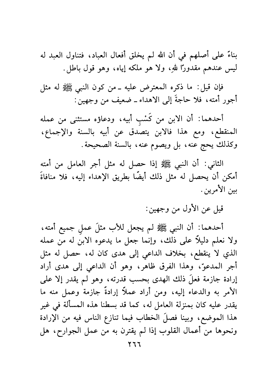 أحدهما: أن النبي - صَلَّى اللَّهُ عَلَيْهِ وَسَلَّمَ - لم يجعل للأب مثلَ عملِ جميع أمته، ولا يعلم دليلاً على ذلك، وإنما جعل ما يدعوه الابن له من عمله الذي لا ينقطع، بخلاف الداعي إلى هدى كان له، حصل له مثل أجر المدعوّ، وهذا الفرق ظاهر، وهو أن الداعي إلى هدى أراد إرادة جازمة فعلَ ذلك الهدى بحسب قدرته، وهو لم يقدر إلا على الأمر به والدعاء إليه، ومن أراد عملاً إرادةً جازمة وعمل منه ما يقدر عليه كان بمنزلة العامل له، كما قد بسطنا هذه المسألة في غير هذا الموضع، وبينا فصلَ الخطاب فيما تنازع الناس فيه من الإرادة ونحوها من أعمال القلوب إذا لم يدربه من عمل الجوارح، هل