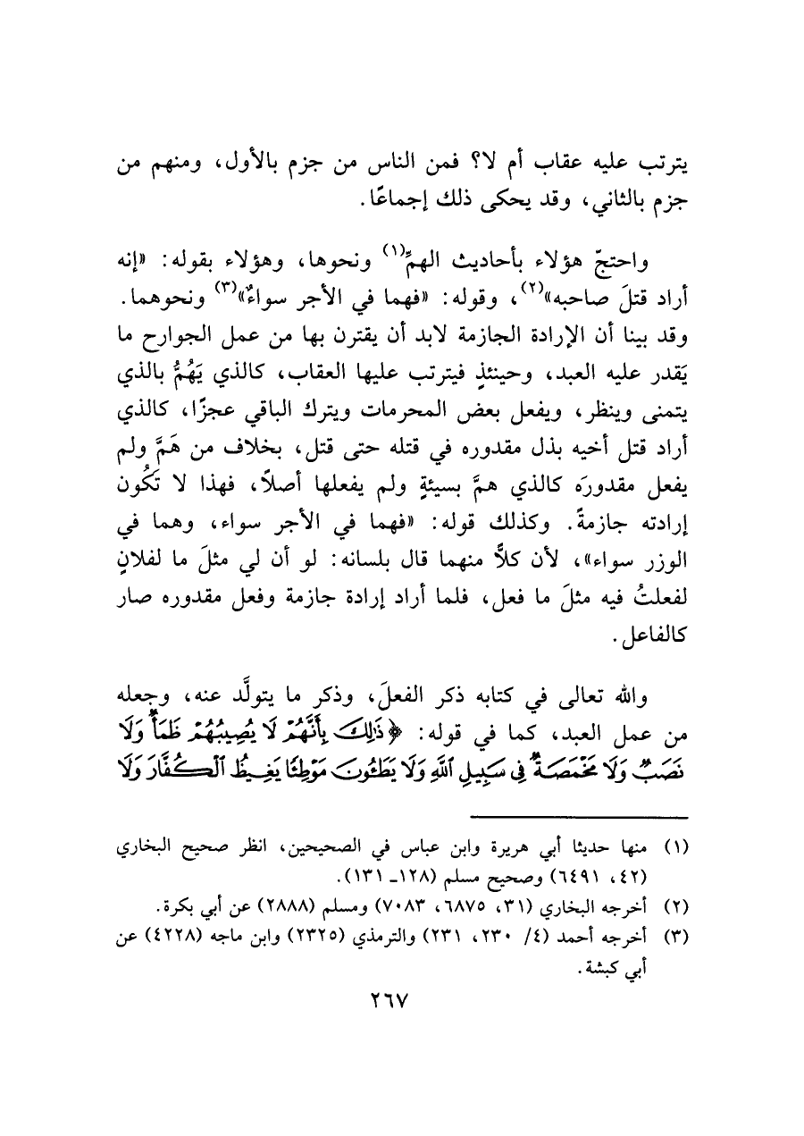 وقد بينا أن الإرادة الجازمة لابد أن يدربها من عمل الجوارح ما يَقدر عليه العبد، وحينئذٍ فيترتب عليها العقاب، كالذي يَهُمُّ بالذي يتمنى وينظر، ويفعل بعض المحرمات ويترك الباقي عجزًا، كالذي أراد قتل أخيه بذل مقدوره في قتله حتى قتل، بخلاف من هَمَّ ولم يفعل مقدورَه كالذي همَّ بسيئةٍ ولم يفعلها أصلاً، فهذا لا تكون إرادته جازمةً. وكذلك قوله: "فهما في الأجر سواء، وهما في الوزر سواء"، لأن كلاًّ منهما قال بلسانه: لو أن لي مثلَ ما لفلانٍ لفعلتُ فيه مثلَ ما فعل، فلما أراد إرادة جازمة وفعل مقدوره صار كالفاعل.