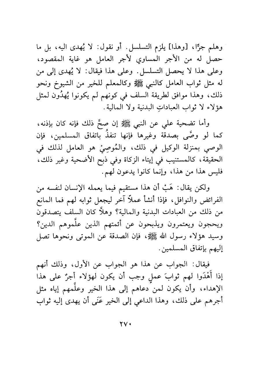 وهلم جرًّا، [وهذا] يلزم التسلسل. أو نقول: لا يُهدى إليه، بل ما حصل له من الأجر المساوي لأجر العامل هو غاية المقصود، وعلى هذا لا يحصل التسلسل. وعلى هذا فيقال: لا يُهدى إلى من له مثل ثواب العامل كالنبي - صَلَّى اللَّهُ عَلَيْهِ وَسَلَّمَ - وكالمعلم للخير من الشيوخ ونحو ذلك، وهذا موافق لطريقة السلف في كونهم لم يكونوا يُهدُون لمثل هؤلاء لا ثواب العباداتِ البدنية ولا المالية.