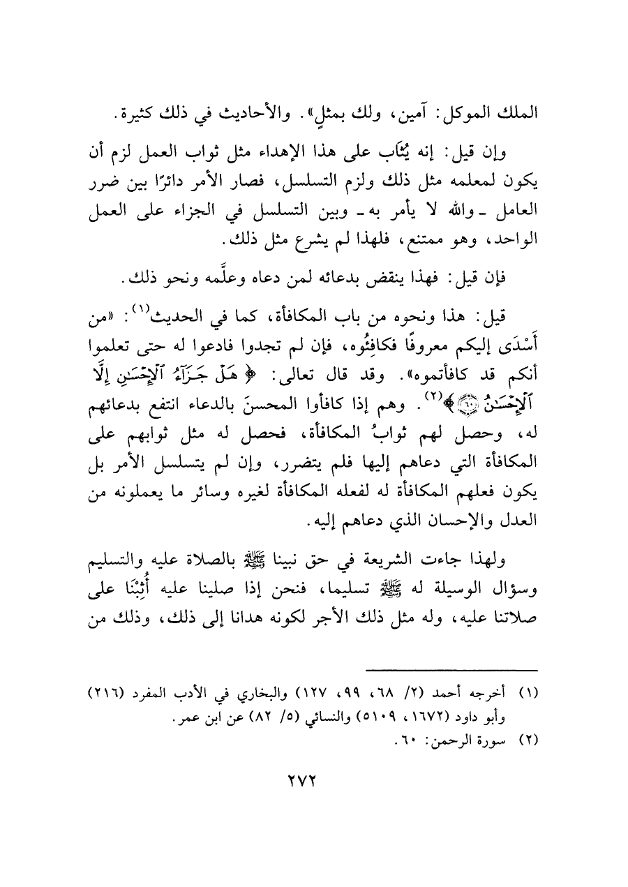 قيل: هذا ونحوه من باب المكافأة، كما في الحديث (¬١): "من أَسْدَى إليكم معروفًا فكافِئُوه، فإن لم تجدوا فادعوا له حتى تعلموا أنكم قد كافأتموه". وقد قال تعالى: (هَلْ جَزَاءُ الْأِحْسَانِ إِلَّا الْأِحْسَانُ (٦٠)) (¬٢). وهم إذا كافأوا المحسنَ بالدعاء انتفع بدعائهم له، وحصل لهم ثوابُ المكافأة، فحصل له مثل ثوابهم على المكافأة التي دعاهم إليها فلم يتضرر، وإن لم يتسلسل الأمر بل يكون فعلهم المكافأة له لفعله المكافأة لغيره وسائر ما يعملونه من العدل والإحسان الذي دعاهم إليه.