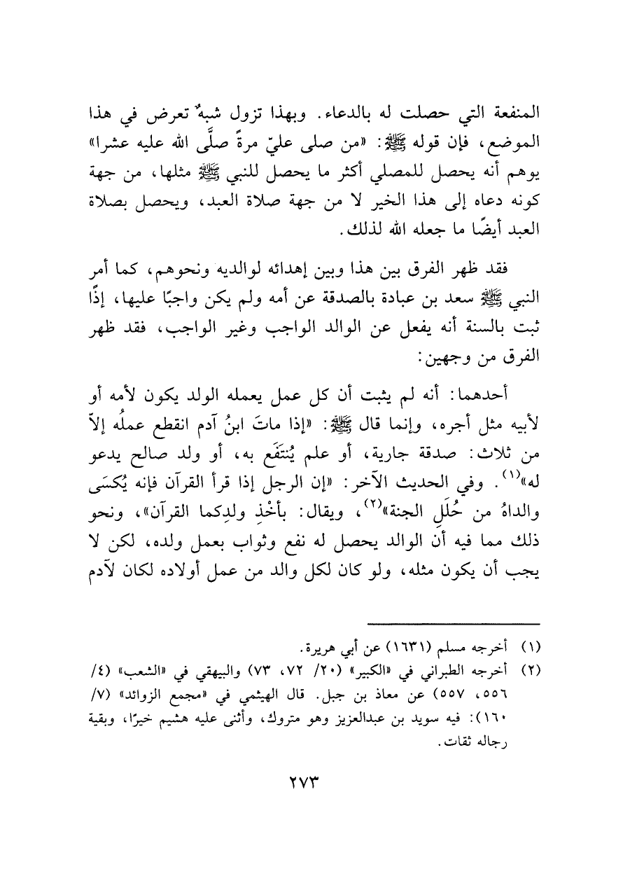 فقد ظهر الفرق بين هذا وبين إهدائه لوالديه ونحوهم، كما أمر النبي - صَلَّى اللَّهُ عَلَيْهِ وَسَلَّمَ - سعد بن عبادة بالصدقة عن أمه ولم يكن واجبًا عليها، إذًا ثبت بالسنة أنه يفعل عن الوالد الواجب وغير الواجب، فقد ظهر الفرق من وجهين: