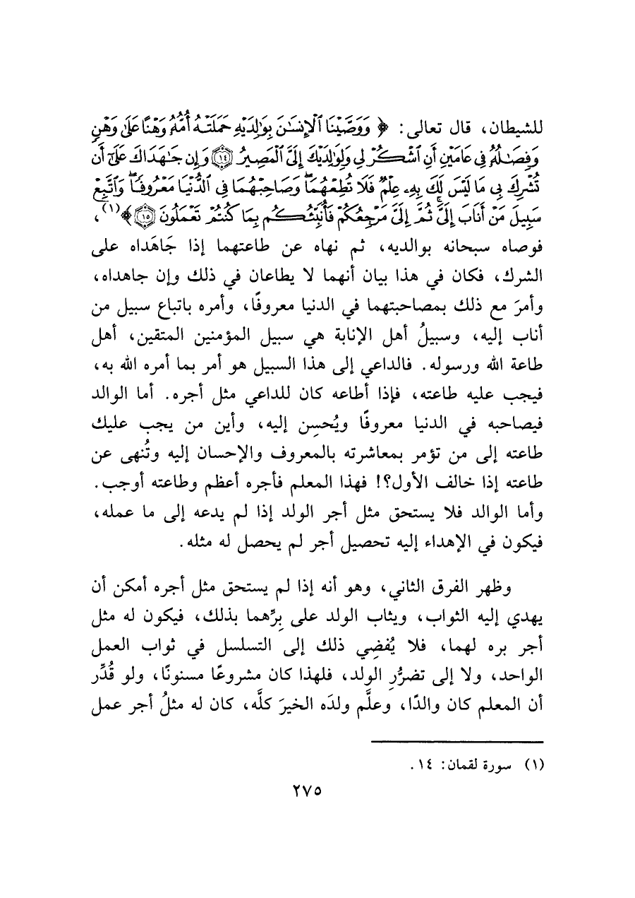 للشيطان، قال تعالى: (وَوَصَّيْنَا الْأِنْسَانَ بِوَالِدَيْهِ حَمَلَتْهُ أُمُّهُ وَهْناً عَلَى وَهْنٍ وَفِصَالُهُ فِي عَامَيْنِ أَنِ اشْكُرْ لِي وَلِوَالِدَيْكَ إِلَيَّ الْمَصِيرُ، وَإِنْ جَاهَدَاكَ عَلَى أَنْ تُشْرِكَ بِي مَا لَيْسَ لَكَ بِهِ عِلْمٌ فَلا تُطِعْهُمَا وَصَاحِبْهُمَا فِي الدُّنْيَا مَعْرُوفاً وَاتَّبِعْ سَبِيلَ مَنْ أَنَابَ إِلَيَّ ثُمَّ إِلَيَّ مَرْجِعُكُمْ فَأُنَبِّئُكُمْ بِمَا كُنْتُمْ تَعْمَلُونَ) (¬١)، فوصاه سبحانه بوالديه، ثم نهاه عن طاعتهما إذا جَاهَداه على الشرك، فكان في هذا بيان أنهما لا يطاعان في ذلك وإن جاهداه، وأمرَ مع ذلك فصاحِبْهما في الدنيا معروفًا، وأمره باتباع سبيل من أناب إليه، وسبيلُ أهل الإنابة هي سبيل المؤمنين المتقين، أهل طاعة الله ورسوله. فالداعي إلى هذا السبيل هو أمر بما أمره الله به، فيجب عليه طاعته، فإذا أطاعه كان للداعي بمثل أجره. أما الوالد فيصاحبه في الدنيا معروفًا ويُحسِن إليه، وإن من يجب عليك طاعته إلي من تؤمر بمعاشرته بالمعروف والإحسان إليه وتُنهى عن طاعته إذا خالف الأول، فهذا المعلم فأجره أعظم وطاعته أوجب. وأما الوالد فلا يستحق مثل أجر الولد إذا لم يدعه إلى ما عمله، فيكون في الإهداء إليه تحصيل أجر لم يحصل له مثله.