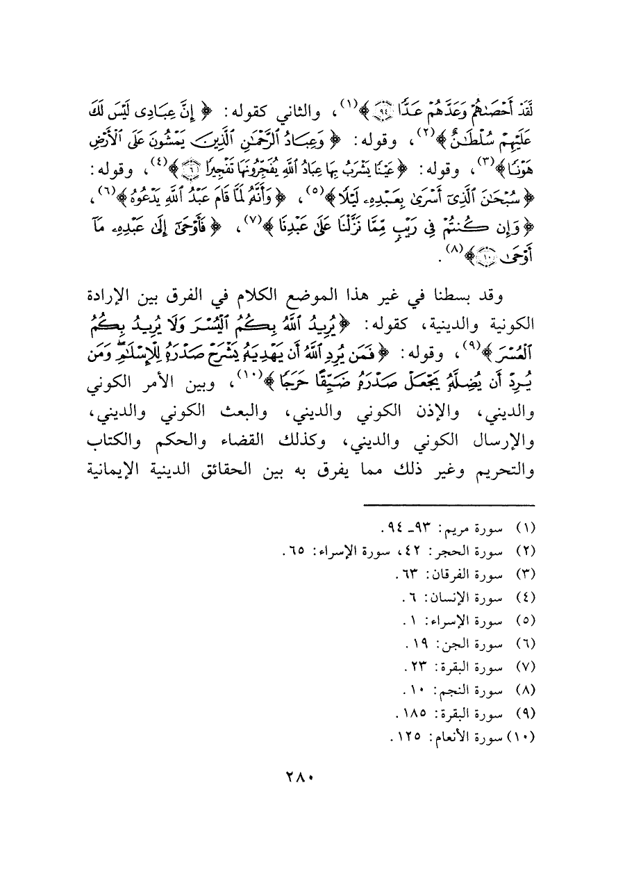 وقد بسطنا في غير هذا الموضع الكلام في الفرق بين الإرادة الكونية والدينية، كقوله (يُرِيدُ اللَّهُ بِكُمُ الْيُسْرَ وَلا يُرِيدُ بِكُمُ الْعُسْرَ) (¬٩)، وقوله: (فَمَنْ يُرِدِ اللَّهُ أَنْ يَهْدِيَهُ يَشْرَحْ صَدْرَهُ لِلإِسْلامِ وَمَنْ يُرِدْ أَنْ يُضِلَّهُ يَجْعَلْ صَدْرَهُ ضَيِّقاً حَرَجاً) (¬١٠)، وبين الأمر الكوني والديني، والإذن الكوني والديني، والبعث الكوني والديني، والإرسال الكوني والديني، وكذلك القضاء والحكم والكتاب والتحريم وغير ذلك مما يفرق به بين الحقائق الدينية الإيمانية
