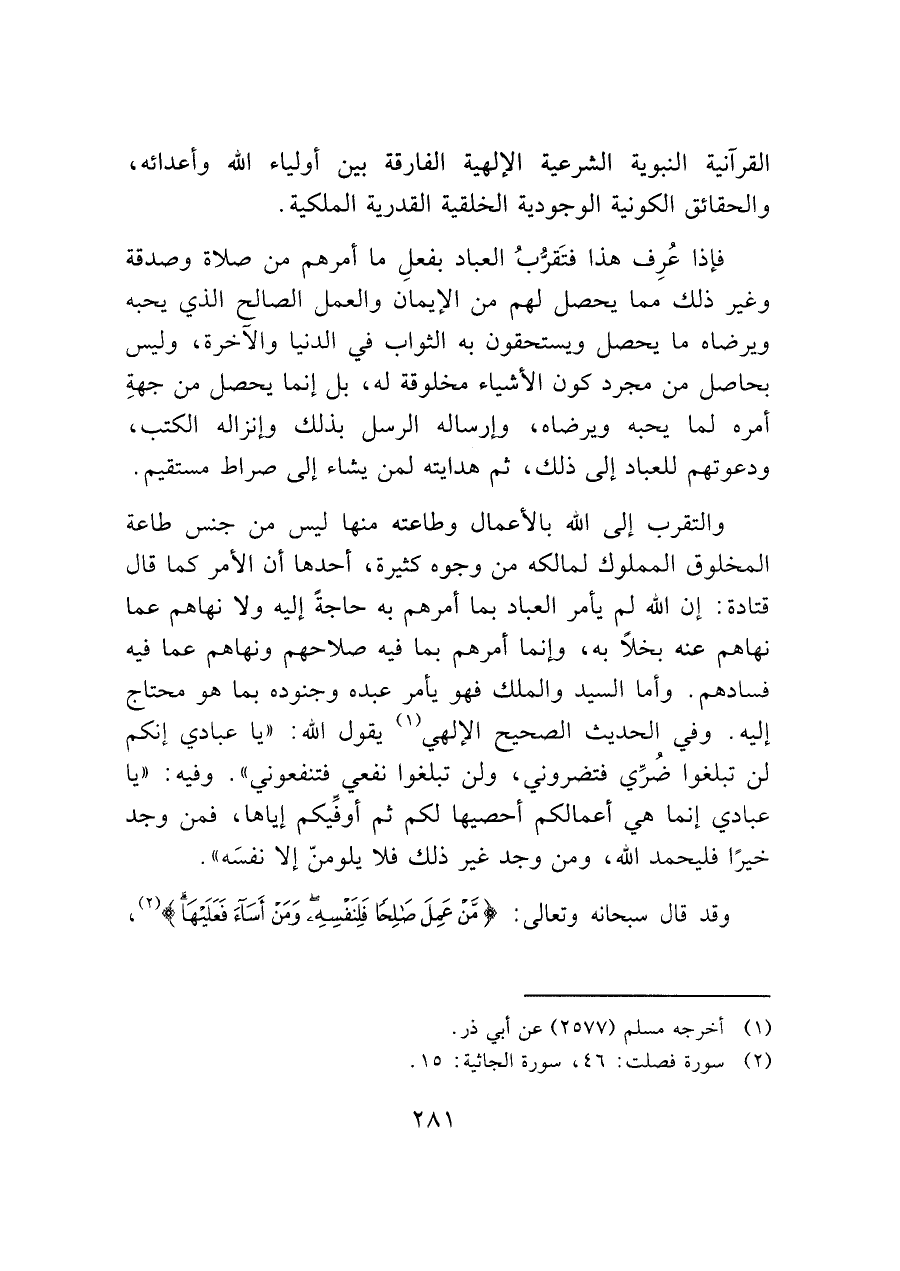 فإذا عُرِف هذا فتَقرُّبُ العباد بفعلِ ما أمرهم من صلاة وصدقة وغير ذلك مما يحصل لهم من الإيمان والعمل الصالح الذي يحبه ويرضاه ما يحصل ويستحقون به الثواب في الدنيا والآخرة، وليس بحاصل من مجرد كون الأشياء مخلوقة له، بل إنما يحصل من جهةِ أمره لما يحبه ويرضاه، وإرساله الرسل بذلك وإنزاله الكتب، ودعوتهم للعباد إلى ذلك، ثم هدايته لمن يشاء إلى صراط مستقيم.