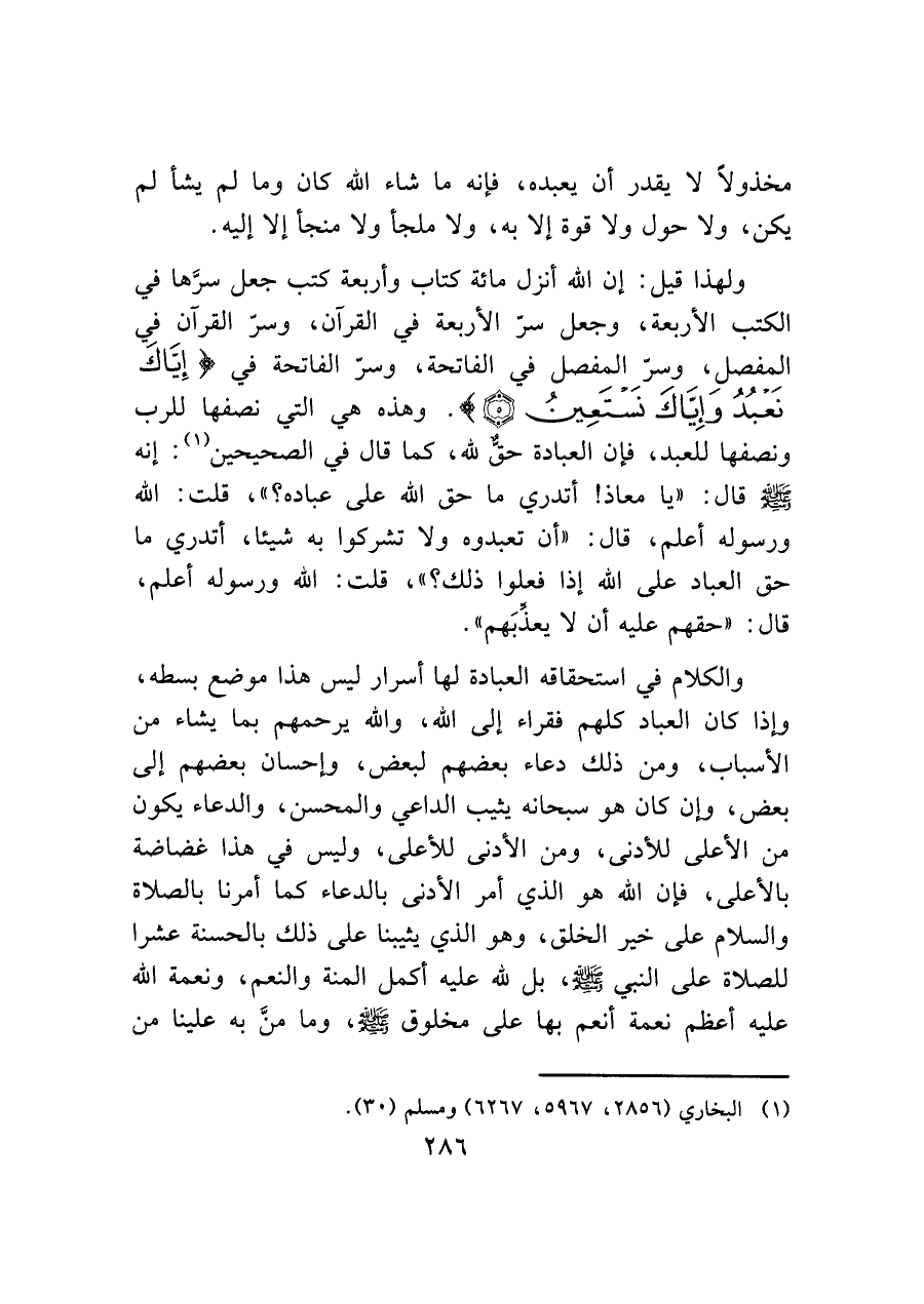 ولهذا قيل: إن الله أنزل مائة كتاب وأربعة كتب جعل سرَّها في الكتب الأربعة، وجعل سرّ الأربعة في القرآن، وسرّ القرآن في المغصل، وسرِّ المفصل في الفاتحة، وسرّ الفاتحة في (إِيَّاكَ نَعْبدُ وَإِيَّاكَ نَسْتَعِينُ). وهذه هي التي نصفها للرب ونصفها للعبد، فإن العبادة حقّ لله، كما قال في الصحيحين (¬١): إنه - صَلَّى اللَّهُ عَلَيْهِ وَسَلَّمَ - قال: "يا معاذ! أتدري ما حق الله على عباده؟ "، قلت: الله ورسوله أعلم، قال: "أن تعبدوه ولا تشركوا به شيئا، أتدري ما حق العباد على الله إذا فعلوا ذلك؟ "، قلت: الله ورسوله أعلم، قال: "حقهم عليه أن لا يعذِّبَهم".