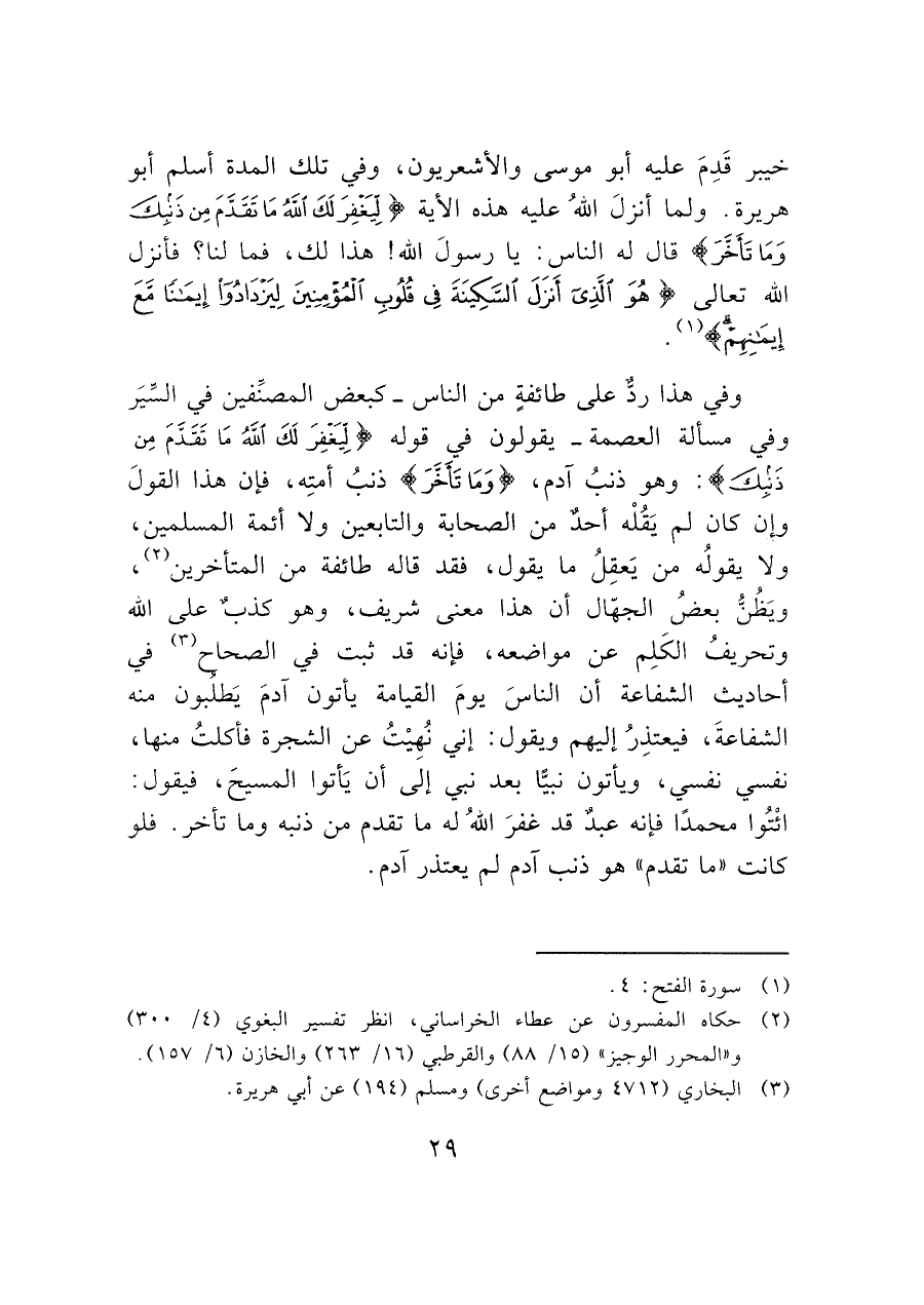 وفي هذا ردٌّ على طائفةٍ من الناس - كبعض المصنِّفين في السِّيَر وفي مسألة العصمة - يقولون في قوله (ليَغفِرَ لَكَ اللهُ مَا تَقَدَمَ مِن ذَنبك): وهو ذنبُ آدم، (وَمَا تَأَخرَ) ذنبُ أمتِه، فإن هذا القولَ وإن كان لم يَقُلْه أحدٌ من الصحابة والتابعين ولا أئمة المسلمين، ولا يقولُه من يَعقِلُ ما يقول، فقد قاله طائفة من المتأخرين (¬٢)، ويَظُنُّ بعضُ الجهال أن هذا معنى شريف، وهو كذب على الله وتحريفُ الكَلِم عن مواضعه، فإنه قد ثبت في الصحاح (¬٣) في أحاديث الشفاعة أن الناسَ يومَ القيامة يأتون آدمَ يَطلبون منه الشفاعةَ، فيعتذِرُ إليهم ويقول: إني نُهِيْتُ عن الشجرة فأكلتُ منها، نفسي نفسي، ويأتون نبيًّا بعد نبي إلى أن يَأتوا المسيحَ، فيقول: ائْتُوا محمدًا فإنه عبد قد غفرَ اللهُ له ما تقدم من ذنبه وما تأخر. فلو كانت "ما تقدم" هو ذنب آدم لم يعتذر آدم.