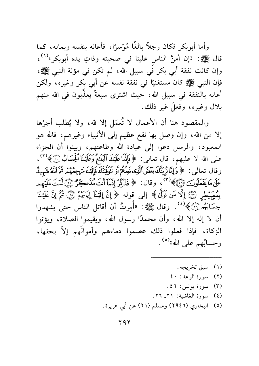 وأما أبو بكر فكان رجلاً بالغًا مُوْسرًا، فأعانه بنفسه وبماله، كما قال - صَلَّى اللَّهُ عَلَيْهِ وَسَلَّمَ -: "إن أمنَّ الناسِ علينا في صحبته وذاتِ يده أبو بكر" (¬١)، وإن كانت نفقة أبي بكر في سبيل الله، لم تكن في مؤنة النبي - صَلَّى اللَّهُ عَلَيْهِ وَسَلَّمَ -، فإن النبي - صَلَّى اللَّهُ عَلَيْهِ وَسَلَّمَ - كان مستغنيًا في نفقة نفسه عن أبي بكر وغيره، ولكن أعانه بالنفقة في سبيل الله، حيث اشترى سبعةً يعذَّبون في الله منهم بلال وغيره، وفعلَ غير ذلك.