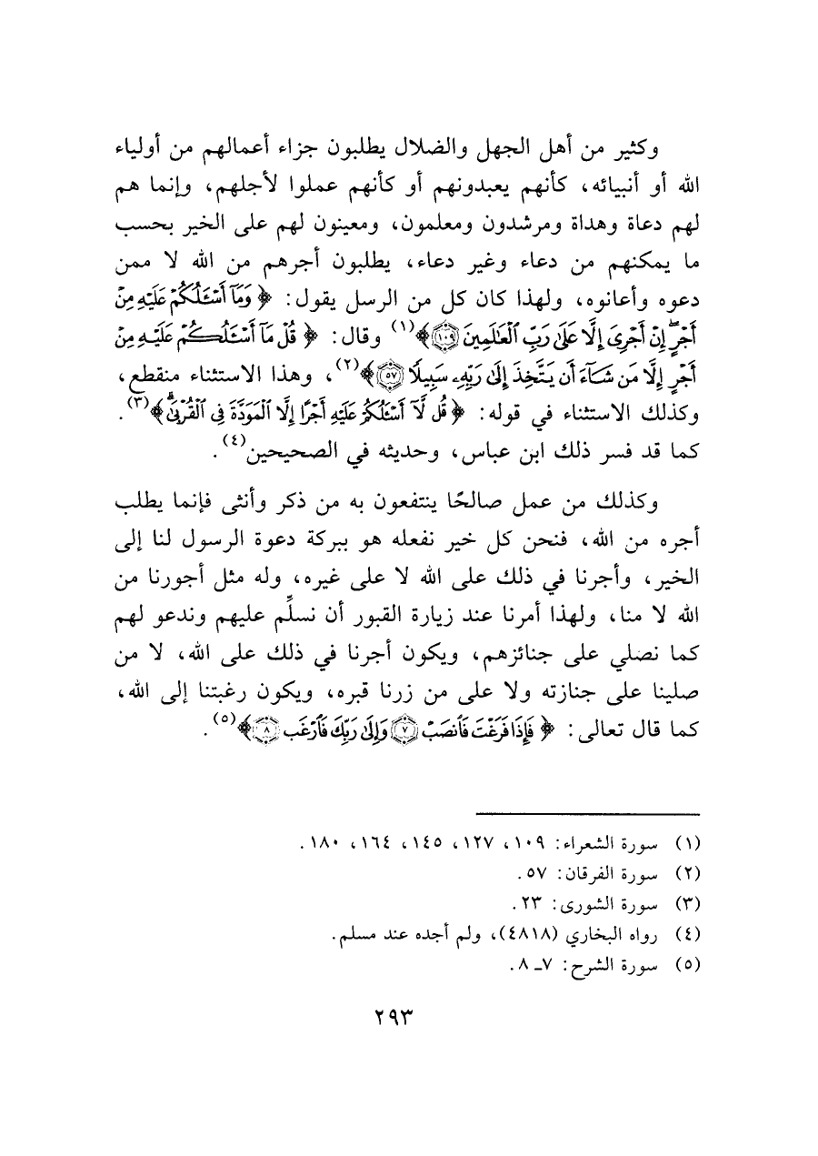 وكثير من أهل الجهل والضلال يطلبون جزاء أعمالهم من أولياء الله أو أنبيائه، كأنهم يعبدونهم أو كأنهم عملوا لأجلهم، وإنما هم لهم دعاة وهداة ومرشدون ومعلمون، ومعينون لهم على الخير بحسب ما يمكنهم من دعاء وغير دعاء، يطلبون أجرهم من الله لا ممن دعوه وأعانوه، ولهذا كان كل من الرسل يقول: (وَمَا أَسْأَلُكُمْ عَلَيْهِ مِنْ أَجْرٍ إِنْ أَجْرِيَ إِلَّا عَلَى رَبِّ الْعَالَمِينَ (١٠٩)) (¬١) وقال:) (قُلْ مَا أَسْأَلُكُمْ عَلَيْهِ مِنْ أَجْرٍ إِلَّا مَنْ شَاءَ أَنْ يَتَّخِذَ إِلَى رَبِّهِ سَبِيلاً (٥٧)) (¬٢)، وهذا الاستثناء منقطع، وكذلك الاستثناء في قوله: (قُلْ لا أَسْأَلُكُمْ عَلَيْهِ أَجْراً إِلَّا الْمَوَدَّةَ فِي الْقُرْبَى) (¬٣).