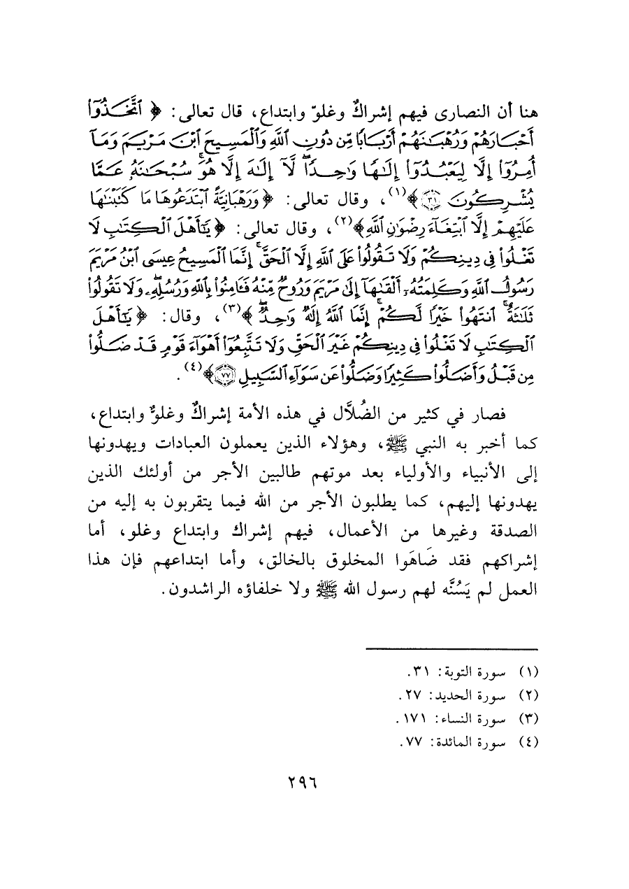 هنا أن النصارى فيهم إشراكٌ وغلوّ وابتداع، قال تعالى: (اتَّخَذُوا أَحْبَارَهُمْ وَرُهْبَانَهُمْ أَرْبَاباً مِنْ دُونِ اللَّهِ وَالْمَسِيحَ ابْنَ مَرْيَمَ وَمَا أُمِرُوا إِلَّا لِيَعْبُدُوا إِلَهاً وَاحِداً لا إِلَهَ إِلَّا هُوَ سُبْحَانَهُ عَمَّا يُشْرِكُونَ (٣١)) (¬١)، وقال تعالى: (وَرَهْبَانِيَّةً ابْتَدَعُوهَا مَا كَتَبْنَاهَا عَلَيْهِمْ إِلَّا ابْتِغَاءَ رِضْوَانِ اللَّه) (¬٢)، وقال تعالى: (يَا أَهْلَ الْكِتَابِ لَا تَغْلُوا فِي دِينِكُمْ وَلَا تَقُولُوا عَلَى اللَّهِ إِلَّا الْحَقَّ إِنَّمَا الْمَسِيحُ عِيسَى ابْنُ مَرْيَمَ رَسُولُ اللَّهِ وَكَلِمَتُهُ أَلْقَاهَا إِلَى مَرْيَمَ وَرُوحٌ مِنْهُ فَآَمِنُوا بِاللَّهِ وَرُسُلِهِ وَلَا تَقُولُوا ثَلَاثَةٌ انْتَهُوا خَيْرًا لَكُمْ إِنَّمَا اللَّهُ إِلَهٌ وَاحِدٌ) (¬٣)، وقال: (يَا أَهْلَ الْكِتَابِ لَا تَغْلُوا فِي دِينِكُمْ غَيْرَ الْحَقِّ وَلَا تَتَّبِعُوا أَهْوَاءَ قَوْمٍ قَدْ ضَلُّوا مِنْ قَبْلُ وَأَضَلُّوا كَثِيرًا وَضَلُّوا عَنْ سَوَاءِ السَّبِيلِ (٧٧)) (¬٤).
