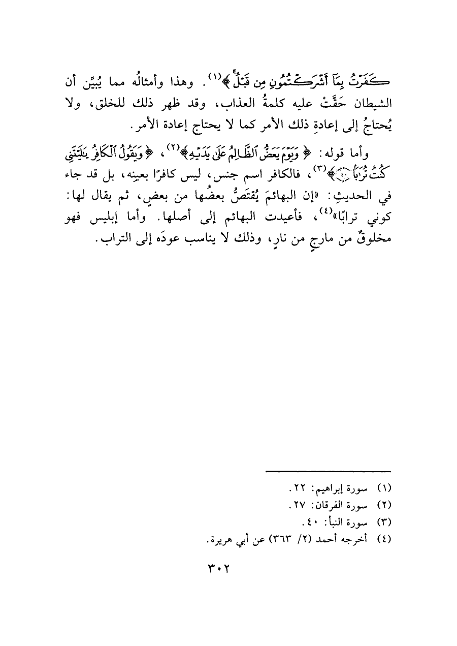 وأما قوله: (وَيَؤمَ يَعَضُّ الظَالِمُ عَلَى يَدَيه) (¬٢)، (وَيَقُولُ الْكَافِرُ يَا لَيْتَنِي كُنْتُ تُرَاباً (٤٠)) (¬٣)، فالكافر اسم جنس، ليس كافرًا بعييه، بل قد جاء في الحديثِ: "إن البهائمَ يُقتَصُّ بعضُها من بعضٍ، ثم يقال لها: كوني ترابًا" (¬٤)، فأعيدت البهائم إلى أصلها. وأما إبليس فهو مخلوقٌ من مارجٍ من نارٍ، وذلك لا يناسب عودَه إلى التراب.