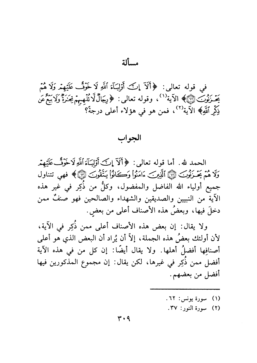 في قوله تعالى: (أَلا إِنَّ أَوْلِيَاءَ اللَّهِ لا خَوْفٌ عَلَيْهِمْ وَلا هُمْ يَحْزَنُونَ (٦٢)) (¬١)، وقوله تعالى: (رِجَالٌ لا تُلْهِيهِمْ تِجَارَةٌ وَلا بَيْعٌ عَنْ ذِكْرِ اللَّهِ) الآية (¬٢)، فمن هو في هؤلاء أعلى درجةً؟