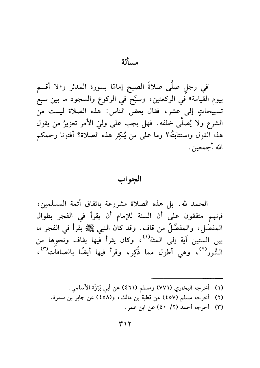 الحمد لله. بل هذه الصلاة مشروعة باتفاق أئمة المسلمين، فإنهم متفقون على أن السنة للإمام أن يقرأ في الفجر بطوال المفصّل، والمفصَّلُ من قاف. وقد كان النبي - صَلَّى اللَّهُ عَلَيْهِ وَسَلَّمَ - يقرأ في الفجر ما بين الستين آية إلى المئة (¬١)، وكان يقرأ فيها بقاف ونحوِها من السُّور (¬٢)، وهي أطول مما ذُكِر، وقرأ فيها أيضًا بالصافات (¬٣)،